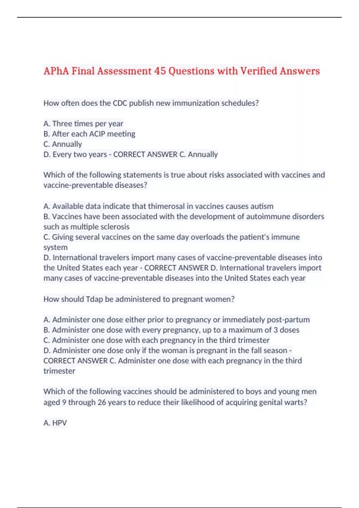 APhA Final Assessment 45 Questions with Verified Answers How often does the CDC publish new immunization schedules? A. Three times per year B. After each ACIP meeting C. Annually D. Every two years - CORRECT ANSWER C. Annually Which of the following statements is true about risks associated with vaccines and vaccine-preventable diseases? A. Available data indicate that thimerosal in vaccines causes autism B. Vaccines have been associated with the development of autoimmune disorders such as multiple sclerosis C. Giving several vaccines on the same day overloads the patient's immune system D. International travelers import many cases of vaccine-preventable diseases into the United States each year - CORRECT ANSWER D. International travelers import many cases of vaccine-preventable diseases into the United States each year How should Tdap be administered to pregnant women? A. Administer one dose either prior to pregnancy or immediately post-partum B. Administer one dose with every pregnancy, up to a maximum of 3 doses C. Administer one dose with each pregnancy in the third trimester D. Administer one dose only if the woman is pregnant in the fall season - CORRECT ANSWER C. Administer one dose with each pregnancy in the third trimester Which of the following vaccines should be administered to boys and young men aged 9 through 26 years to reduce their likelihood of acquiring genital warts? A. HPV B. Hib C. Varicella D. MenB - CORRECT ANSWER A. HPV Michael, a 47-year-old health care worker, has no laboratory evidence of immunity to measles or mumps and cannot confirm that he had either disease. How many doses of MMR vaccine should Michael receive? A. One dose of MMR B. Two doses of MMR C. No doses of MMR because he is considered immune to measles and mumps D. No doses of MMR because he could pass the virus to his patients after receiving the vaccine - CORRECT ANSWER B. Two doses of MMR Tasha is a 26-year-old woman with rheumatoid arthritis who is treated with immunosuppressive therapy. Which of the following vaccines should be avoided for Tasha? A. HPV B. MenACWY C. MMR D. Herpes Zoster (RZV) - CORRECT ANSWER C. MMR If a patient is experiencing anaphylaxis and requires epinephrine, what is the dose and route of administration using a 1:1000 (1mg/mL) product? A. 1 mg/kg IM in the deltoid muscle B. 0.5mg IIM in the deltoid muscle C. 1 mg IM in the anterolateral aspect of the thigh D. 0.01 mg/kg IM in the anterolateral aspect of the thigh - CORRECT ANSWER D. 0.01 mg/kg IM in the anterolateral aspect of the thigh David is 58 years old. He received an inactivated influenza vaccine 5 days ago at a mass clinical run by the health department. He is now at your pharmacy and you determine he should get his herpes zoster and Tdap vaccines. How should you proceed with administering these vaccines? A. Give both Tdap and the herpes zoster vaccines today B. Wait 23 more days then administer the Tdap and herpes zoster vaccines C. Administer Tdap today and wait 23 days to administer the herpes zoster vaccine D. Admi - CORRECT ANSWER A. Give both Tdap and the herpes zoster vaccines today Which of the following tetanus toxoid-containing vaccines would be appropriate for a 15-month old child? A. DT B. Td C. DTaP D. Tdap - CORRECT ANSWER C. DTaP Larry is 68 years old and has a new grandbaby on the way. He received a Td vaccine approximately 13 years ago. He doesn't know if he received any tetanus toxoid-containing vaccines prior to that. Which of the following tetanus toxoid-containing vaccines should be most appropriate to recommend? A. DTap B. DT C. Td D. Tdap - CORRECT ANSWER D. Tdap Which of the following is a contraindication that is applied to all vaccines? A. Immunocompromising condition B. Severe allergic reaction to a vaccine component following a previous dose C. Pregnancy D. Hives following receipt of a prior dose of vaccine - CORRECT ANSWER B. Severe allergic reaction to a vaccine component following a previous dose Mariah is a 15-year old high school student with no chronic medical conditions. She is at the pharmacy to receive her COVID-19 booster and influenza vaccines. She completed the primary series of DTaP, IPV, PCV, Hib, and MMR. She received the complete series of hepatitis A and hepatitis B vaccines before entering high school. What other vaccines does she need? A. Varicella, MenB (per shared clinical decision-making), PPSV23 B. DTaP, HPV, MenACWY C. Varicella, Tdap, HPV, MenACWY D. HPV, MenB (per - CORRECT ANSWER C. Varicella, Tdap, HPV, MenACWY How do vaccines elicit an immune response? A. They deliver antibodies that provide immediate protection against disease B. They activate B cells that directly attack and destroy foreign antigens C. They contain antigens that stimulate the production of antibodies D. They rely on macrophages and natural killer cells to eliminate the pathogen - CORRECT ANSWER C. They contain antigens that stimulate the production of antibodies How many doses of the 13-valent pneumococcal conjugate vaccine (PCV13) are needed to complete the routine series in children beginning at. 2 months of age? A. 1 B. 3 C. 4 D. 5 - CORRECT ANSWER C. 4 At what ages is the first dose of the rotavirus vaccine recommended? A. 2 months B. 6 months C. 1 year D. 2 years - CORRECT ANSWER A. 2 months Which of the following is true for the recommended catch-up immunization schedule? A. It is for children who start late or are more than 1 month behind on immunizations B. It is for adults who have missed doses in a vaccine series C. It is categorized based on medication condition or indication D. Doses administered sooner than the minimum interval listed may be counted - CORRECT ANSWER A. It is for children who start late or are more than 1 month behind on immunizations Which of the following represents an opportunity for pharmacists to collaborate with other providers? A. Offer to store vaccines in the pharmacy's refrigerator or freezer B. Offer to administer the remaining doses in a vaccine se