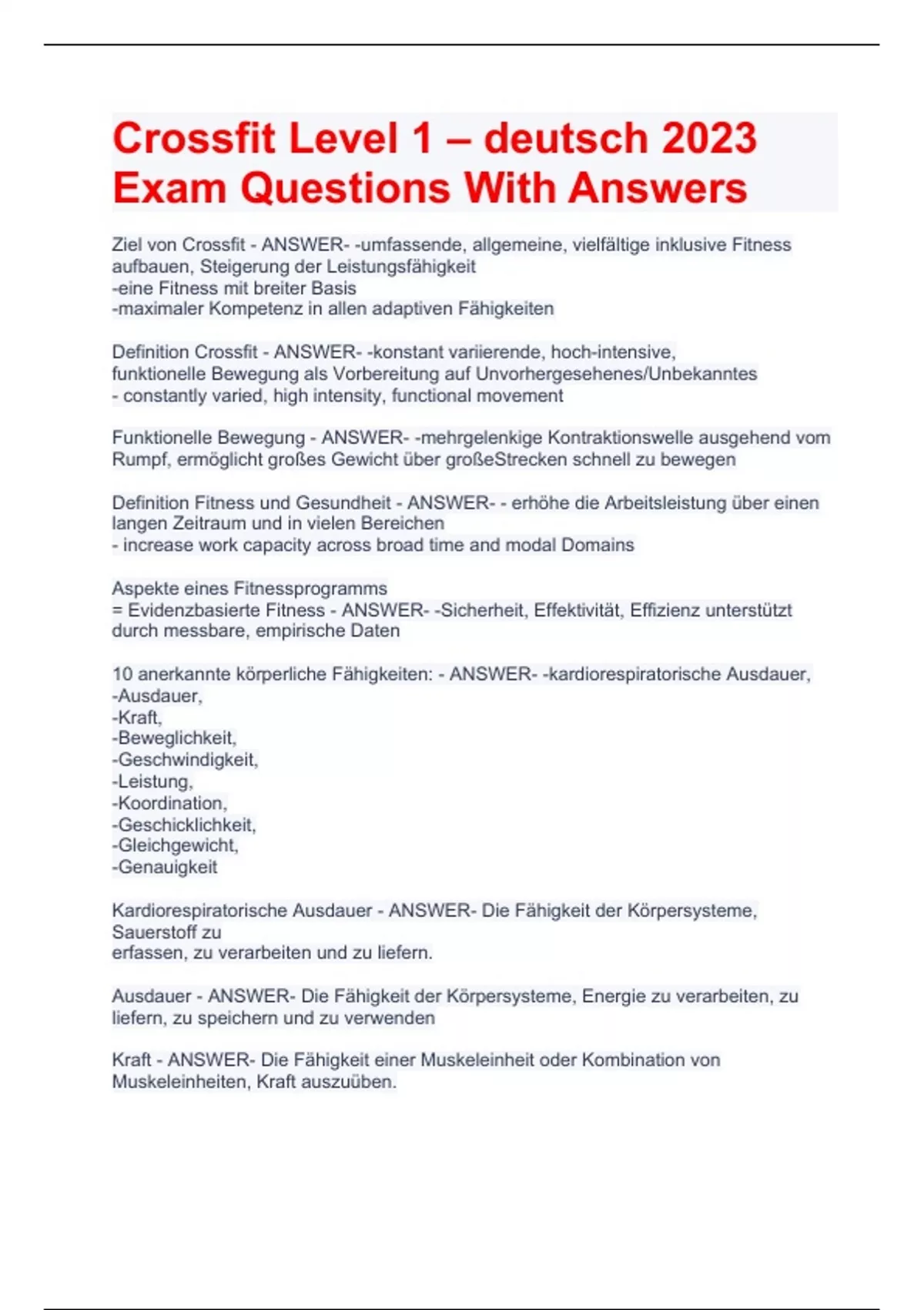 Crossfit Level 1 – deutsch 2025 Exam Questions With Answers New Update Ziel von Crossfit - ANSWER- -umfassende, allgemeine, vielfältige inklusive Fitness aufbauen, Steigerung der Leistungsfähigkeit -eine Fitness mit breiter Basis -maximaler Kompetenz in allen adaptiven Fähigkeiten Definition Crossfit - ANSWER- -konstant variierende, hoch-intensive, funktionelle Bewegung als Vorbereitung auf Unvorhergesehenes/Unbekanntes - constantly varied, high intensity, functional movement Funktionelle Bewegung - ANSWER- -mehrgelenkige Kontraktionswelle ausgehend vom Rumpf, ermöglicht großes Gewicht über großeStrecken schnell zu bewegen Definition Fitness und Gesundheit - ANSWER- - erhöhe die Arbeitsleistung über einen langen Zeitraum und in vielen Bereichen - increase work capacity across broad time and modal Domains Aspekte eines Fitnessprogramms = Evidenzbasierte Fitness - ANSWER- -Sicherheit, Effektivität, Effizienz unterstützt durch messbare, empirische Daten 10 anerkannte körperliche Fähigkeiten: - ANSWER- -kardiorespiratorische Ausdauer, -Ausdauer, -Kraft, -Beweglichkeit, -Geschwindigkeit, -Leistung, -Koordination, -Geschicklichkeit, -Gleichgewicht, -Genauigkeit Kardiorespiratorische Ausdauer - ANSWER- Die Fähigkeit der Körpersysteme, Sauerstoff zu erfassen, zu verarbeiten und zu liefern. Ausdauer - ANSWER- Die Fähigkeit der Körpersysteme, Energie zu verarbeiten, zu liefern, zu speichern und zu verwenden Kraft - ANSWER- Die Fähigkeit einer Muskeleinheit oder Kombination von Muskeleinheiten, Kraft auszuüben. Beweglichkeit - ANSWER- Die Fähigkeit, den Bewegungsumfang bei einem gegebenen Gelenk zu maximieren Leistung - ANSWER- Die Fähigkeit einer Muskeleinheit oder Kombination von Muskeleinheiten, eine maximale Kraft in einem minimalen Zeitraum auszuüben. Geschwindigkeit - ANSWER- Die Fähigkeit, den Zeitzyklus einer wiederholten Bewegung zu minimieren. Koordination - ANSWER- Die Fähigkeit, mehrere unterschiedliche Bewegungsmuster in eine einzige Bewegung zu kombinieren Geschicklichkeit - ANSWER- Die Fähigkeit, die Übergangszeit von einem Bewegungsmuster in ein anderes zu minimieren. Gleichgewicht - ANSWER- Die Fähigkeit, die Position des Gravitationszentrums des Körpers im Verhältnis zu seiner Stützbasis zu kontrollieren. Genauigkeit - ANSWER- Die Fähigkeit, die Bewegung in eine bestimmte Richtung oder mit einer bestimmten Intensität zu kontrollieren. Crossfit Methode - ANSWER- -Ernährung -Metabolische Konditionierung -Turnen -Gewichtheben und Werfen -Sport Crossfit und Ernährung - ANSWER- -legt die molekularen Grundlagen für Fitness und Gesundheit. Metabolische Konditionierung - ANSWER- -baut Kapazität in den drei Stoffwechselwegen auf, beginnend mit dem aeroben, dann dem Milchsäure- und dann dem Phosphokreatin-Stoffwechselweg Turnen im Crossfit - ANSWER- -baut funktionelle Kapazität in den Bereichen Körperbeherrschung und Bewegungsumfang auf. Gewichtheben und Werfen im Crossfit - ANSWER- -entwickelt die Fähigkeit, externe Objekte zu kontrollieren und Leistung zu erzeugen. Sport bzgl. Crossfit - ANSWER- -wendet Fitness in einer anderen Sportart mit mehr zufälligen,willkürlichen Bewegungen und andern Fähigkeiten Energiesysteme - ANSWER- -drei Hauptenergiesysteme -die Effektivität eines beliebigen Fitnessprogramms hängt wesentlich von seiner Fähigkeit ab, angemessene Trainingsreize zu setzen, die zur Veränderungen in diesen drei Energiesystemen führen. -Aerob (oxidativ), Anaerob (Phosphagensystem und Milchsäuresystem/glykolytisch) Aerob - ANSWER- -wenn mit Hilfe von Sauerstoff Substrate aus Nahrungsmitteln metabolisiert werden und dadurch Energie entsteht -länger als neunzig Sekunden und erzeugen eine niedrige bis moderate Leistung bzw. Intensität -verbessert die kardiovaskuläre Funktion und reduziert Körperfett -moderate/niedrige Leistung über längere Zeiträume Anaerob - ANSWER- - wenn Energie aus Substraten in der Abwesenheit von Sauerstoff freigesetzt wird. - weniger als zwei Minuten und schließen eine moderate bis hohe Leistung oder Intensität ein. - das Phosphagensystem und das Milchsäuresystem -für die kardiovaskuläre Funktion vorteilhaft und reduziert das Körperfett - steigert Leistung, Geschwindigkeit, Kraft und Muskelmasse zwei Disziplinen des olympischen Gewichthebens - ANSWER- -Umsetzen und Stoßen (Clean and Jerk) -Reißen (Snatch) Auswirkungen des olympischen Gewichthebens auf den Athleten - ANSWER- -aktiviert Muskelfasern schneller --> erzeugt Explosivität - lehrt die Muskelkraft in der richtigen Sequenz auszuüben --> von Körpermitte zu den Extremitäten - Körper lernt, wie er Kräfte von sich bewegenden Objekten sicher und effizient aufnehmen kann - Entwicklung von Kraft, Muskeln, Leistung, Geschwindigkeit, Koordination, Vertikalsprung, Muskelausdauer, Knochenstärke und die körperliche Kapazität - Erhöhung der maximale Sauerstoffaufnahme --> kardiovaskuläre Fitness Turnen als Trainingsreiz - ANSWER- -das Eigengewicht des Körpers ist die einzige Widerstandsquelle Auswirkungen des Turnens auf den Athleten - ANSWER- -verbessert das Verhältnis Körperkraft zu Körpergewicht -Verbesserung der Koordination, Gleichgewicht, Geschicklichkeit, Genauigkeit, und Beweglichkeit Fähigkeiten im Turnen - ANSWER- Klimmzüge, Kniebeugen, Ausfallschritte, Springen, Liegestützen und jede Menge Drückvariationen für Handstände, Klettern und versch. Griffe