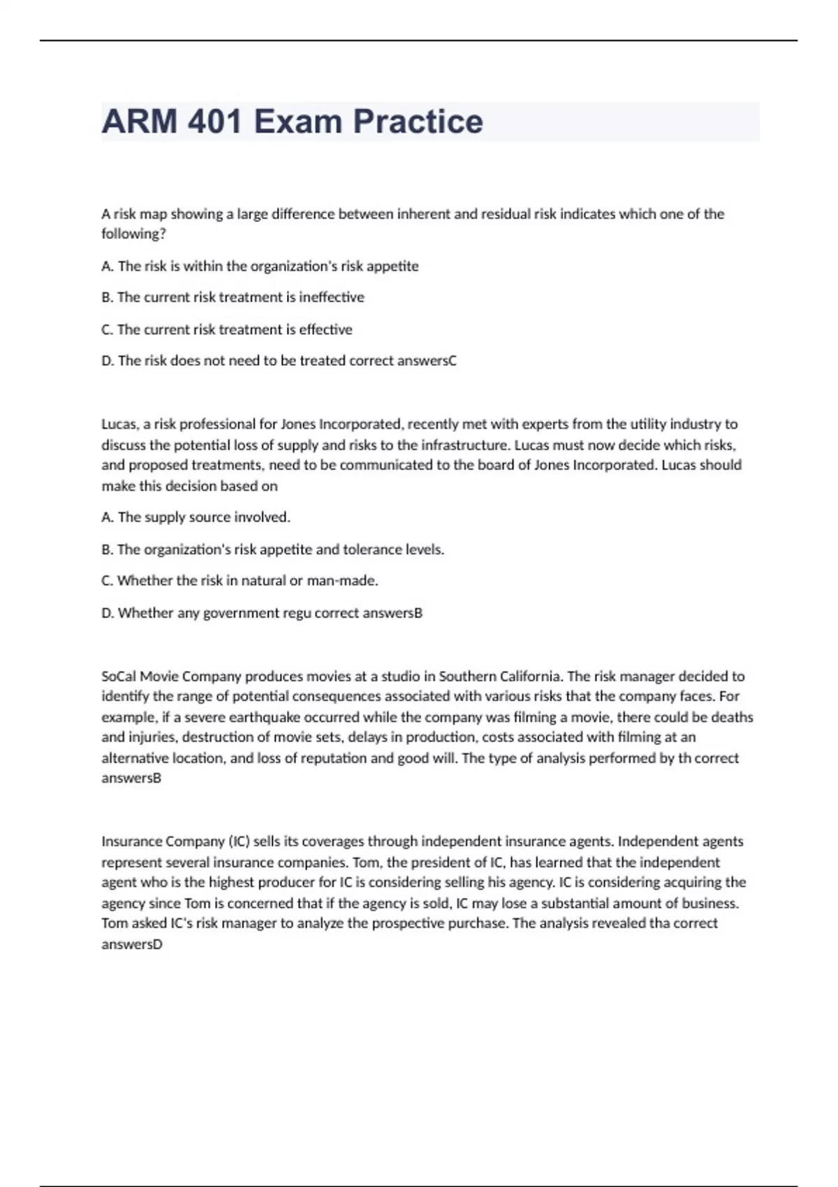 A risk map showing a large difference between inherent and residual risk indicates which one of the following? A. The risk is within the organization's risk appetite B. The current risk treatment is ineffective C. The current risk treatment is effective D. The risk does not need to be treated C Lucas, a risk professional for Jones Incorporated, recently met with experts from the utility industry to discuss the potential loss of supply and risks to the infrastructure. Lucas must now decide which risks, and proposed treatments, need to be communicated to the board of Jones Incorporated. Lucas should make this decision based on A. The supply source involved. B. The organization's risk appetite and tolerance levels. C. Whether the risk in natural or man-made. D. Whether any government regu B SoCal Movie Company produces movies at a studio in Southern California. The risk manager decided to identify the range of potential consequences associated with various risks that the company faces. For example, if a severe earthquake occurred while the company was filming a movie, there could be deaths and injuries, destruction of movie sets, delays in production, costs associated with filming at an alternative location, and loss of reputation and good will. The type of analysis performed by th B Insurance Company (IC) sells its coverages through independent insurance agents. Independent agents represent several insurance companies. Tom, the president of IC, has learned that the independent agent who is the highest producer for IC is considering selling his agency. IC is considering acquiring the agency since Tom is concerned that if the agency is sold, IC may lose a substantial amount of business. Tom asked IC's risk manager to analyze the prospective purchase. The analysis revealed tha D