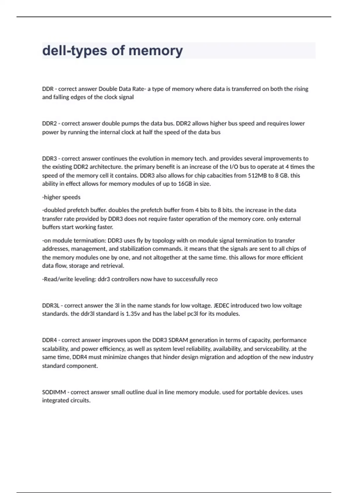 dell-types of memoryDDR - correct answer Double Data Rate- a type of memory where data is transferred on both the rising and falling edges of the clock signal DDR2 - correct answer double pumps the data bus. DDR2 allows higher bus speed and requires lower power by running the internal clock at half the speed of the data bus DDR3 - correct answer continues the evolution in memory tech. and provides several improvements to the existing DDR2 architecture. the primary benefit is an increase of the I/O bus to operate at 4 times the speed of the memory cell it contains. DDR3 also allows for chip cabacities from 512MB to 8 GB. this ability in effect allows for memory modules of up to 16GB in size. -higher speeds -doubled prefetch buffer. doubles the prefetch buffer from 4 bits to 8 bits. the increase in the data transfer rate provided by DDR3 does not require faster operation of the memory core. only external buffers start working faster. -on module termination: DDR3 uses fly by topology with on module signal termination to transfer addresses, management, and stabilization commands. it means that the signals are sent to all chips of the memory modules one by one, and not altogether at the same time. this allows for more efficient data flow, storage and retrieval. -Read/write leveling: ddr3 controllers now have to successfully reco DDR3L - correct answer the 3l in the name stands for low voltage. JEDEC introduced two low voltage standards. the ddr3l standard is 1.35v and has the label pc3l for its modules. DDR4 - correct answer improves upon the DDR3 SDRAM generation in terms of capacity, performance scalability, and power efficiency, as well as system level reliability, availability, and serviceability. at the same time, DDR4 must minimize changes that hinder design migration and adoption of the new industry standard component. SODIMM - correct answer small outline dual in line memory module. used for portable devices. uses integrated circuits.