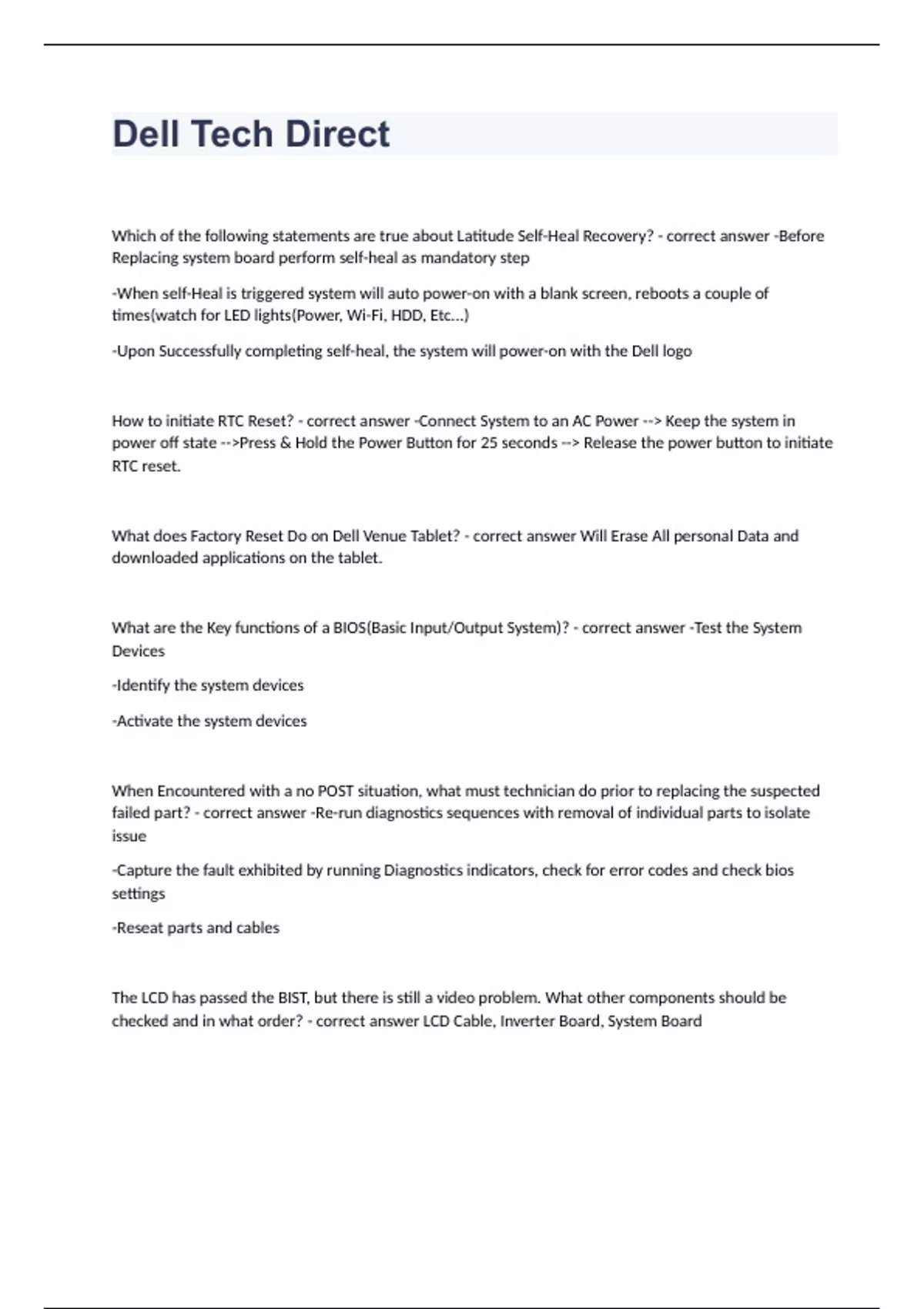 Which of the following statements are true about Latitude Self-Heal Recovery? - correct answer -Before Replacing system board perform self-heal as mandatory step -When self-Heal is triggered system will auto power-on with a blank screen, reboots a couple of times(watch for LED lights(Power, Wi-Fi, HDD, Etc...) -Upon Successfully completing self-heal, the system will power-on with the Dell logo How to initiate RTC Reset? - correct answer -Connect System to an AC Power --> Keep the system in power off state -->Press & Hold the Power Button for 25 seconds --> Release the power button to initiate RTC reset. What does Factory Reset Do on Dell Venue Tablet? - correct answer Will Erase All personal Data and downloaded applications on the tablet. What are the Key functions of a BIOS(Basic Input/Output System)? - correct answer -Test the System Devices -Identify the system devices -Activate the system devices When Encountered with a no POST situation, what must technician do prior to replacing the suspected failed part? - correct answer -Re-run diagnostics sequences with removal of individual parts to isolate issue -Capture the fault exhibited by running Diagnostics indicators, check for error codes and check bios settings -Reseat parts and cables The LCD has passed the BIST, but there is still a video problem. What other components should be checked and in what order? - correct answer LCD Cable, Inverter Board, System Board If ePSA passes the hard drive test and still the system does not load the operating system, what could be the issue? - correct answer Corrupt or missing operating system Which dell diagnostic tool can be used as a trouble shooting tool when the system fails to boot into the OS? - correct answer ePSA Under which service plans can you schedule hardware and software scans, clean files manually, and tune system performance using Support Assist? - correct answer -Basic -Premium Support -ProSupport -ProSupport Plus -Premium Support Plus How will the Dell Command Utility update help Customers? - correct answer Dell Command Utility update will check online for latest BIOS, driver,firmware and Dell application updates for a system and also helps to download and install updates. When would you run RMA shim tool on a Chromebook? - correct answer In the event of system board replacement You are fixing a computer running on windows 8.1 and it is not booting. which of the BIOS setting will you change? - correct answer -Change boot mode to UEFI, -Enable secure boot, -Enable Legacy Option ROMs What are the advantages of SSD when compared to traditional HDD? - correct answer -Faster Data read/write speeds -Lower Latency -Less prone to physical features -Silent operations When to use RTC reset? - correct answer To recover from o POST/No Boot