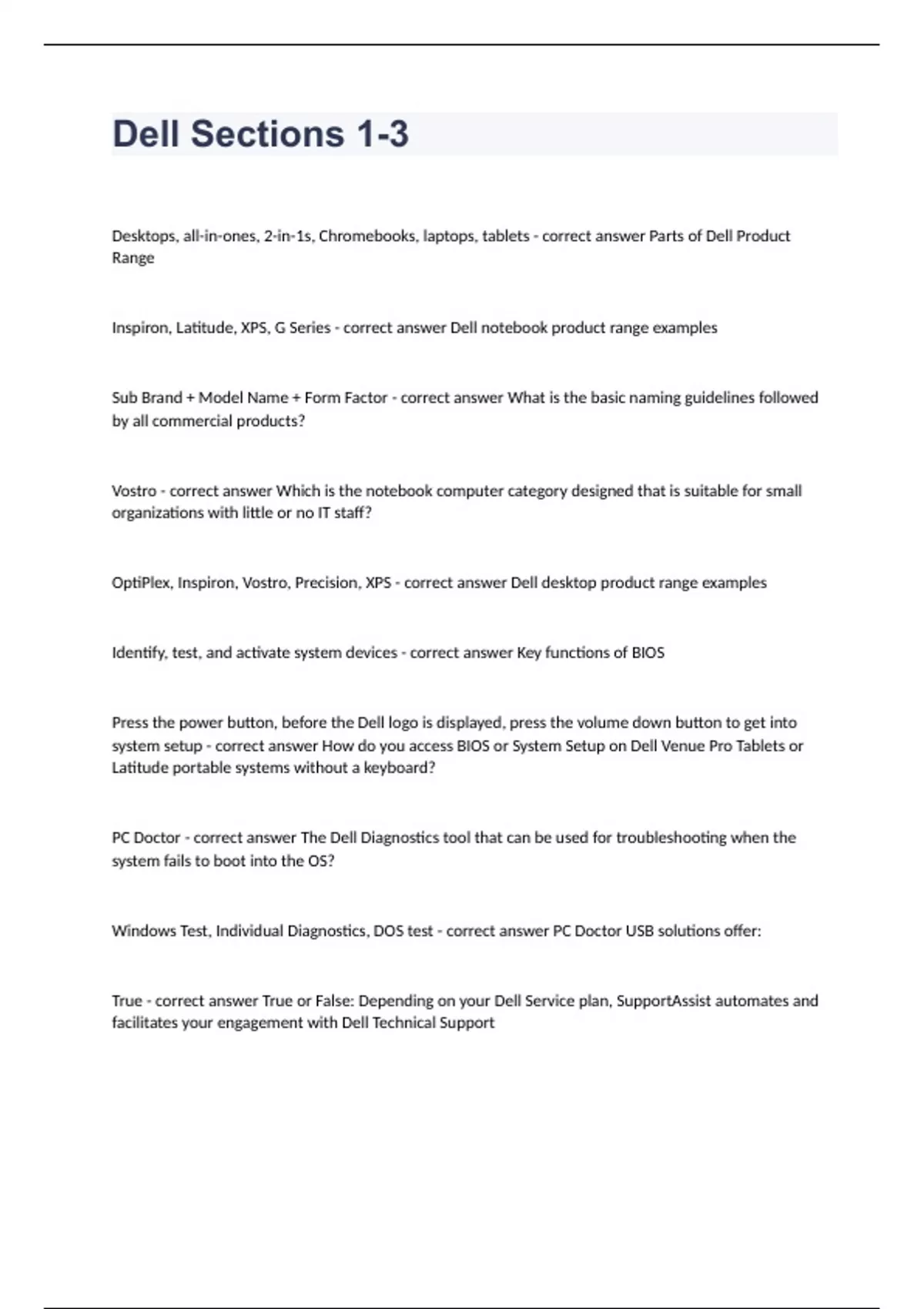 Dell Sections 1-3 Desktops, all-in-ones, 2-in-1s, Chromebooks, laptops, tablets - correct answer Parts of Dell Product Range Inspiron, Latitude, XPS, G Series - correct answer Dell notebook product range examples Sub Brand + Model Name + Form Factor - correct answer What is the basic naming guidelines followed by all commercial products? Vostro - correct answer Which is the notebook computer category designed that is suitable for small organizations with little or no IT staff? OptiPlex, Inspiron, Vostro, Precision, XPS - correct answer Dell desktop product range examples Identify, test, and activate system devices - correct answer Key functions of BIOS Press the power button, before the Dell logo is displayed, press the volume down button to get into system setup - correct answer How do you access BIOS or System Setup on Dell Venue Pro Tablets or Latitude portable systems without a keyboard? PC Doctor - correct answer The Dell Diagnostics tool that can be used for troubleshooting when the system fails to boot into the OS? Windows Test, Individual Diagnostics, DOS test - correct answer PC Doctor USB solutions offer: True - correct answer True or False: Depending on your Dell Service plan, SupportAssist automates and facilitates your engagement with Dell Technical Support Premium Support, Basic, ProSupport Plus, ProSupport, Premium Support Plus - correct answer Under which service plans can you schedule hardware and software scans, clean files manually and tune system performance using SupportAssist? Use the up and down arrow key to select <diagnostics> on the menu and press enter OR power up the system and press the F12 key multiple times during the boot process to go to the boot menu - correct answer Steps to launch ePSA diagnostics blinking (2,6) - correct answer The status of the power LED when a system board failure has occurred Will erase all personal data and downloaded applications on the tablet - correct answer What does the Factory Data Reset do on a Dell Venue tablet? FastBoot - correct answer _____ is the pre=boot environment of Android that starts before Android Press F12 to enter one time boot menu and then select diagnostics - correct answer How will you initiate ePSA in a Dell system? F12 - correct answer Which key is used to access the one time boot menu while restarting the computer?