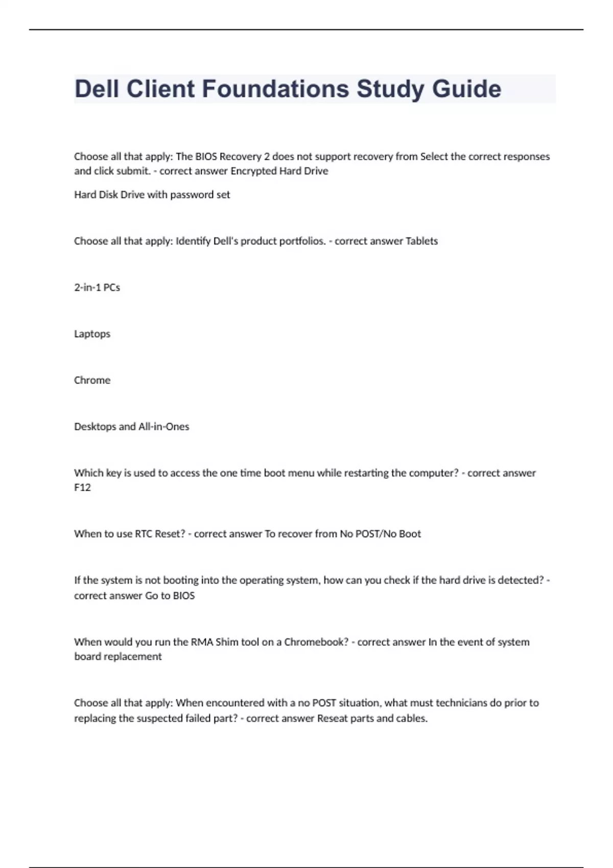 Dell Client Foundations Study Guide Choose all that apply: The BIOS Recovery 2 does not support recovery from Select the correct responses and click submit. - correct answer Encrypted Hard Drive Hard Disk Drive with password set Choose all that apply: Identify Dell's product portfolios. - correct answer Tablets 2-in-1 PCs Laptops Chrome Desktops and All-in-Ones Which key is used to access the one time boot menu while restarting the computer? - correct answer F12 When to use RTC Reset? - correct answer To recover from No POST/No Boot If the system is not booting into the operating system, how can you check if the hard drive is detected? - correct answer Go to BIOS When would you run the RMA Shim tool on a Chromebook? - correct answer In the event of system board replacement Choose all that apply: When encountered with a no POST situation, what must technicians do prior to replacing the suspected failed part? - correct answer Reseat parts and cables. Re-run diagnostic sequences with removal of individual parts to isolate issue. Capture the fault exhibited by running Diagnostics indicators, check for Error Codes and check BIOS settings. T/F: Dell desktop portfolios include OptiPlex, Inspiron, Vostro, Precision, XPS, and All-in-One. - correct answer True If recovery image from both system's primary hard drive and external USB key is present, which image will the BIOS Recovery 2 tool select? - correct answer Recovery image from the external USB key How will the Dell Command Utility Update help Customers? - correct answer Dell Command Utility Update will check online for the latest BIOS, driver, Firmware and Dell Application updates for a system and also helps to download and install the updates. T/F: M.2 is a data transfer protocol while NVMe is the form factor. - correct answer False If ePSA passes the hard drive test and still the system does not load the operating system, what could the issue be? - correct answer Corrupt or missing operating system Choose all that apply: Select all the steps involved in unpacking parts. - correct answer If the part has visible damage, do not use the part. Contact Dell technical support to dispatch another part. Return the part with a description of the damage. Place the box on a secure surface and break the tamper proof seal with a safe tool. Carefully open the package top or lid. All parts must be handled by lifting and holding from the edges or sides. Avoid touching the surface or bottom of the parts. Do not break the tamper proof seal on the ESD bag unless you intend to install the part immediately.