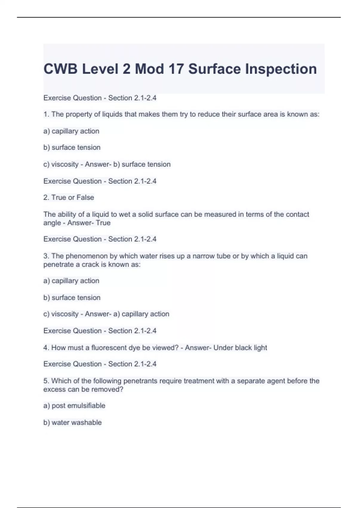 CWB Level 2 Mod 17 Surface Inspection Exam Questions and Answers