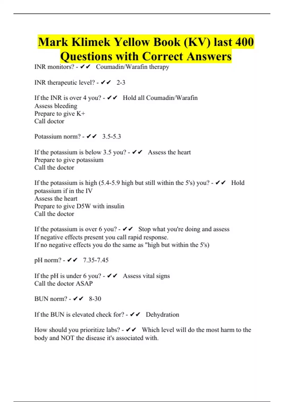 Mark Klimek Yellow Book (KV) last 400 Questions with Correct Answers