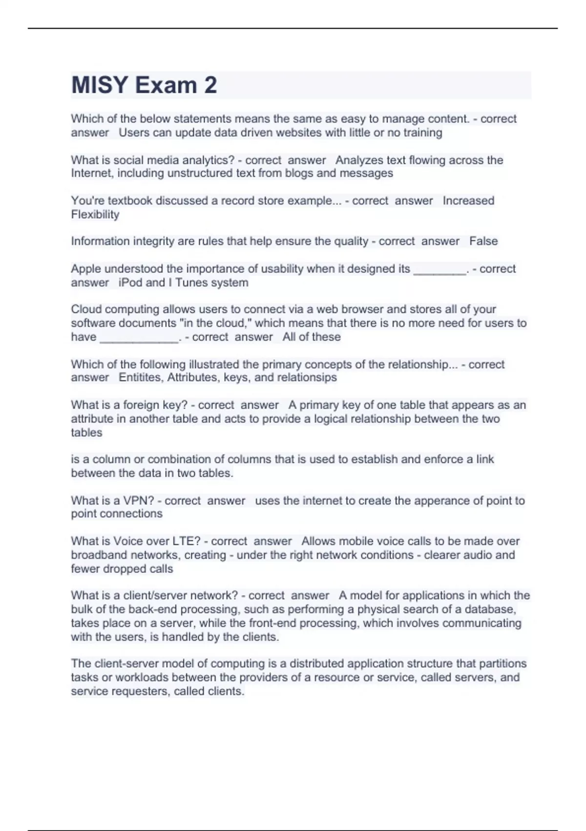 MISY Exam 2 Question and answers correctly solved 2023/2024Which of the below statements means the same as easy to manage content. - correct answer Users can update data driven websites with little or no training What is social media analytics? - correct answer Analyzes text flowing across the Internet, including unstructured text from blogs and messages You're textbook discussed a record store example... - correct answer Increased Flexibility Information integrity are rules that help ensure the quality - correct answer False Apple understood the importance of usability when it designed its ________. - correct answer iPod and I Tunes system Cloud computing allows users to connect via a web browser and stores all of your software documents "in the cloud," which means that there is no more need for users to have ____________. - correct answer All of these Which of the following illustrated the primary concepts of the relationship... - correct answer Entitites, Attributes, keys, and relationsips