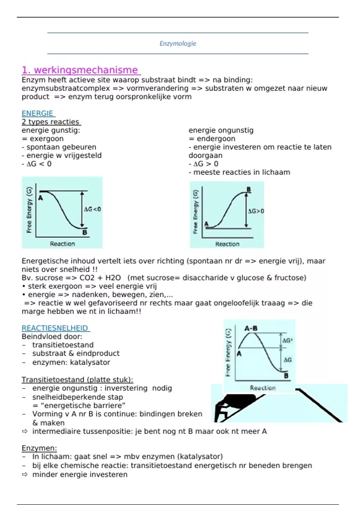 Over de werkingsmechanismen (katalyse, cofactoren/coenzymen), de kinetiek (o.a. Michaelis-Menten kinetiek, homeostase) en de regulatie (Hb, covalente modificatie) van enzymen. Enkele voorbeeldvragen inbegrepen