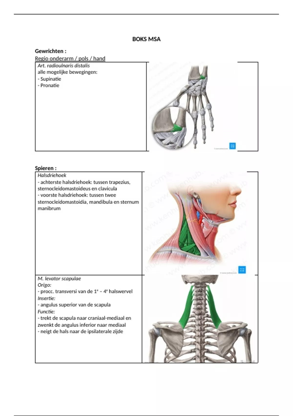 In dit document is de gehele boks lijst van het blok MSA uitgewerkt. Hierin staan o.a. de naam van de spier, de functie van de spier, en ook plaatjes van waar de spieren zitten.
