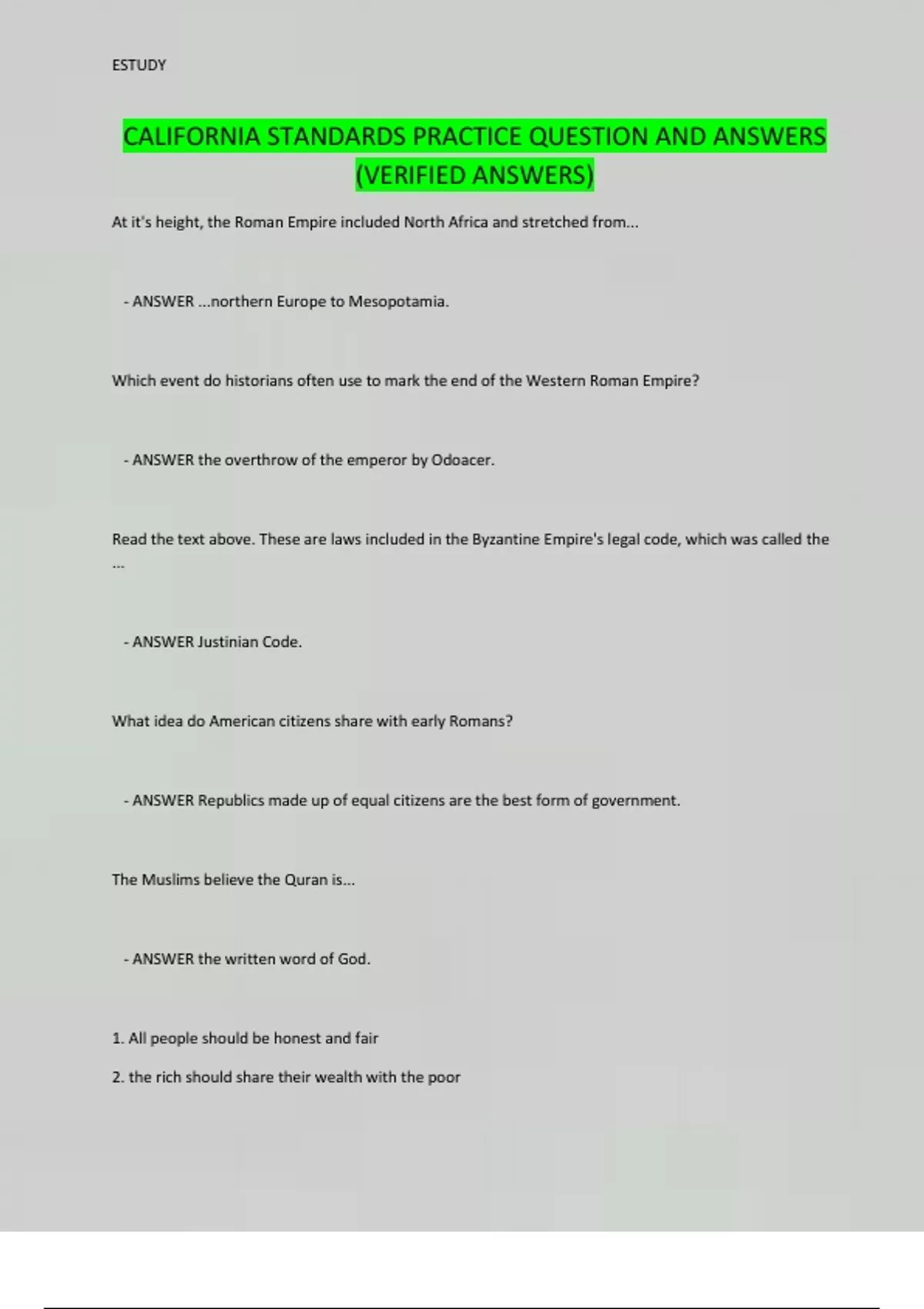 CALIFORNIA STANDARDS PRACTICE QUESTION AND ANSWERS (VERIFIED ANSWERS)