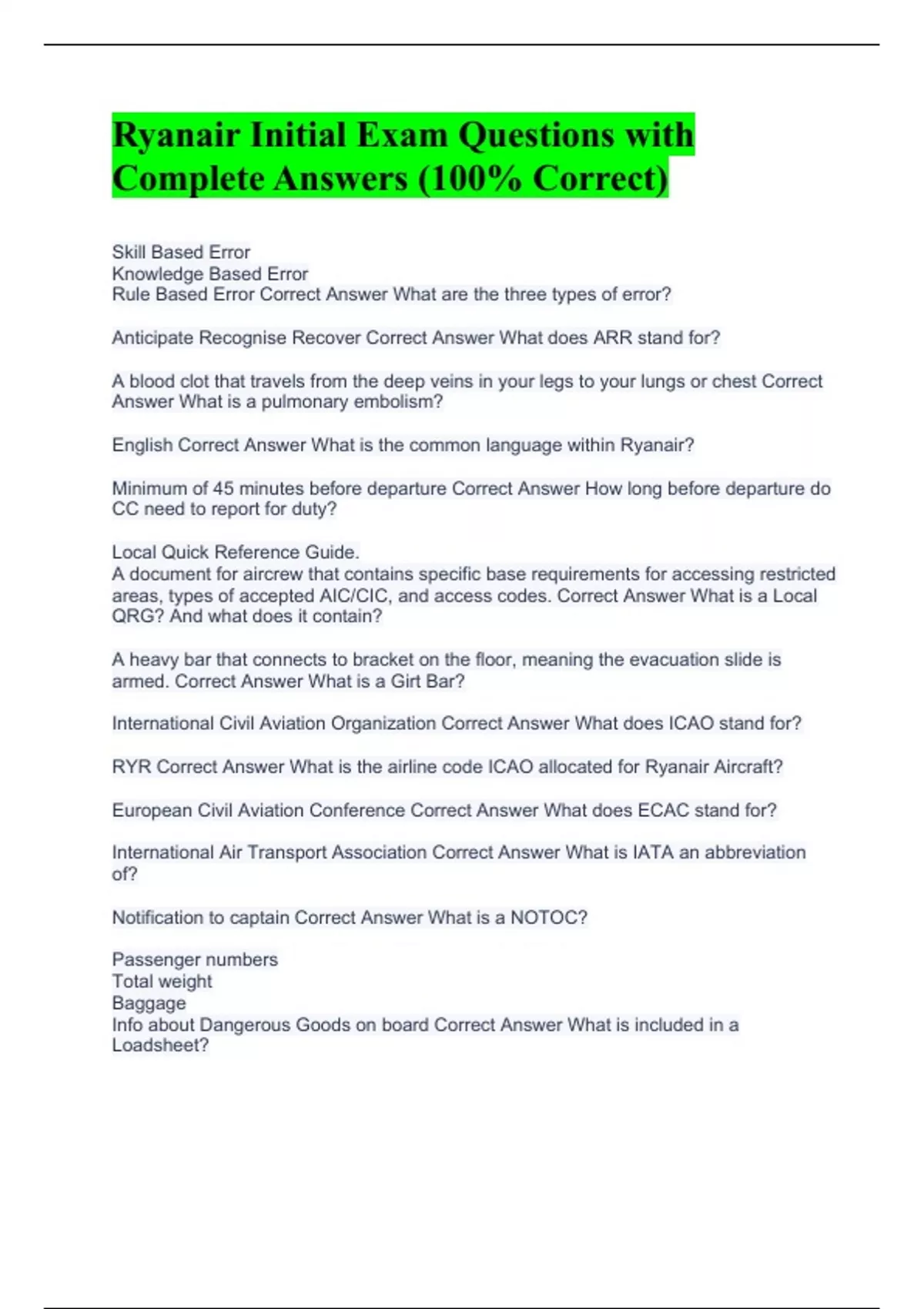 Ryanair Initial Exam Questions with Complete Answers (100% Correct)