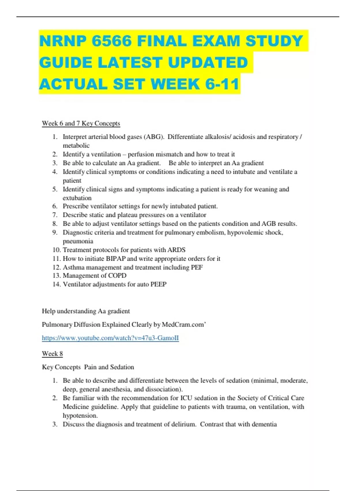 NRNP 6566 FINAL EXAM STUDY GUIDE LATEST UPDATED ACTUAL SET WEEK 6-11 Week 6 and 7 Key Concepts 1. Interpret arterial blood gases (ABG). Differentiate alkalosis/ acidosis and respiratory / metabolic 2. Identify a ventilation – perfusion mismatch and how to treat it 3. Be able to calculate an Aa gradient. Be able to interpret an Aa gradient 4. Identify clinical symptoms or conditions indicating a need to intubate and ventilate a patient 5. Identify clinical signs and symptoms indicating a patient is ready for weaning and extubation 6. Prescribe ventilator settings for newly intubated patient. 7. Describe static and plateau pressures on a ventilator 8. Be able to adjust ventilator settings based on the patients condition and AGB results. 9. Diagnostic criteria and treatment for pulmonary embolism, hypovolemic shock, pneumonia 10. Treatment protocols for patients with ARDS 11. How to initiate BIPAP and write appropriate orders for it 12. Asthma management and treatment including PEF 13. Management of COPD 14. Ventilator adjustments for auto PEEP Help understanding Aa gradient Pulmonary Diffusion Explained Clearly by MedC’ Week 8 Key Concepts Pain and Sedation 1. Be able to describe and differentiate between the levels of sedation (minimal, moderate, deep, general anesthesia, and dissociation). 2. Be familiar with the recommendation for ICU sedation in the Society of Critical Care Medicine guideline. Apply that guideline to patients with trauma, on ventilation, with hypotension. 3. Discuss the diagnosis and treatment of delirium. Contrast that with dementia 4. Describe the step by step process for Rapid Sequence Intubation (RSI) 5. Identify medications used RSI 6. Know common doses of etomidate and succinylcholine. Be able to calculate those doses. 7. Describe the CDC guide for managing acute pain and opioid sensitive prescribing. 8. Differentiate the different types of pain and the best medications to treat them.