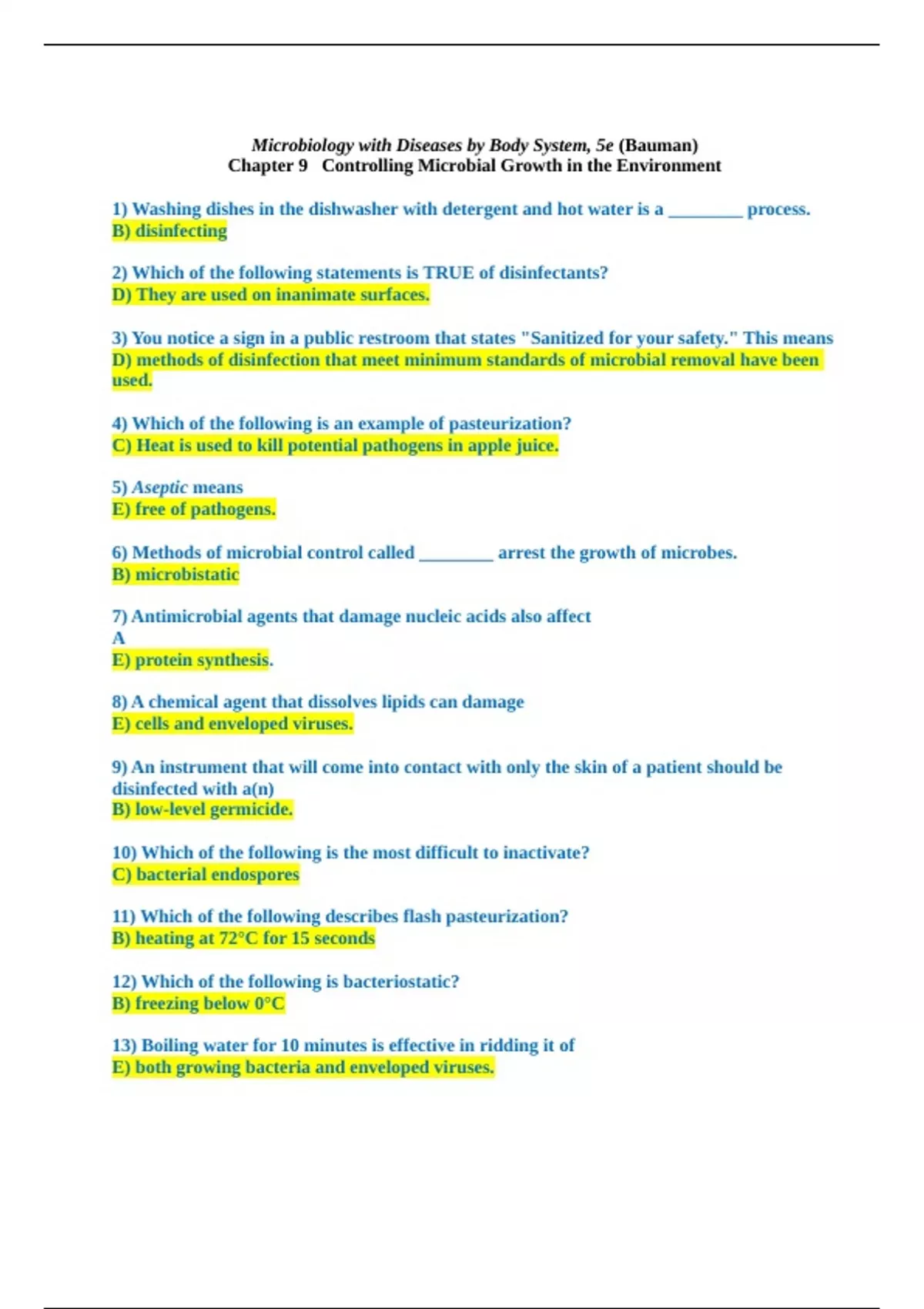 MICR 290 Final Exam Q&A - West Coast University, Los Angeles Microbiology with Diseases by Body System, 5e (Bauman) Chapter 9 Controlling Microbial Growth in the Environment 1) Washing dishes in the dishwasher with detergent and hot water is a ________ process. B) disinfecting 2) Which of the following statements is TRUE of disinfectants? D) They are used on inanimate surfaces. 3) You notice a sign in a public restroom that states "Sanitized for your safety." This means D) methods of disinfection that meet minimum standards of microbial removal have been used. 4) Which of the following is an example of pasteurization? C) Heat is used to kill potential pathogens in apple juice. 5) Aseptic means E) free of pathogens. 6) Methods of microbial control called ________ arrest the growth of microbes. B) microbistatic 7) Antimicrobial agents that damage nucleic acids also affect A E) protein synthesis. 8) A chemical agent that dissolves lipids can damage E) cells and enveloped viruses. 9) An instrument that will come into contact with only the skin of a patient should be disinfected with a(n) B) low-level germicide. 10) Which of the following is the most difficult to inactivate? C) bacterial endospores 11) Which of the following describes flash pasteurization? B) heating at 72°C for 15 seconds 12) Which of the following is bacteriostatic? B) freezing below 0°C 13) Boiling water for 10 minutes is effective in ridding it of E) both growing bacteria and enveloped viruses. 14) Which of the following is NOT a feature associated with filtration? C) varying thicknesses of membrane filters used 15) Ultra-high-temperature sterilization effectively D) removes all microbes that cause diseases or spoilage. 16) Which of the following types of radiation is nonionizing and has the shortest wavelength? A) ultraviolet light 17) Which of the following is used for microbial control in fresh fruits and vegetables? E) gamma rays 18) Which of the following can be used to reduce microbes in the air of a patient's room? D) both HEPA filters and ultraviolet light 19) Silvadene, a topical treatment for burns, contains 1% silver. What category of chemical control agent is in Silvadene? B) heavy metals 20) Which of the following is the most appropriate pairing of microbe and biosafety level? D) methicillin-resistant Staphylococcus aureus (MRSA), BSL-2 21) The use of lysozyme during the preparation of cheeses and wines is effective in reducing the numbers of C) bacteria. 22) Seventy percent alcohol is effective against A) enveloped viruses. 23) Which of the following is a sterilizing agent? C) peracetic acid 24) Quaternary ammonium compounds are disinfectants effective against E) enveloped viruses. 25) Which of the following is used to sterilize items that should not, or cannot, be exposed to heat or water? A) ethylene oxide 26) What effect do aldehydes have on microbial organisms? E) They damage proteins and DNA. 27) Disinfecting agents naturally produced by microorganisms are B) antibiotics. 28) A chemical agent that kills pathogenic microbes in general is a(n) B) germicide. 29) Which of the following is NOT a desirable characteristic of an ideal antimicrobial agent? D) It only arrests growth of vegetative cells. 30) Why are endospores used to measure the effectiveness of autoclave sterilization? C) Endospores are very hard to kill. 31) A scientist develops a new medication that is a protein compound and that must be administered by injection. Which of the following would be the most effective and safest means of preparing a sterile solution of the new medication? B) filtration 32) Which of the following procedures is currently the standard test used in the United States for evaluating the efficiency of antiseptics and disinfectants? A) use-dilution test 33) Which of the following would be used to sterilize a mattress? C) ethylene oxide 34) Disinfectants that damage membranes include E) both alcohol and phenolics. 35) Which of the following antimicrobial agents is the most toxic to humans? B) ethylene oxide 36) The process of filtration is a(n) B) sterilizing method. 37) Hydrogen peroxide is an effective D) disinfecting and sterilizing agent. 38) The process of incineration is used for A) sterilization. 39) Alcohols are used for E) both antisepsis and disinfection. 40) Quaternary ammonium compounds ("quats") are used for B) disinfection. 41) The compound ethylene oxide is used in . . . . . . .