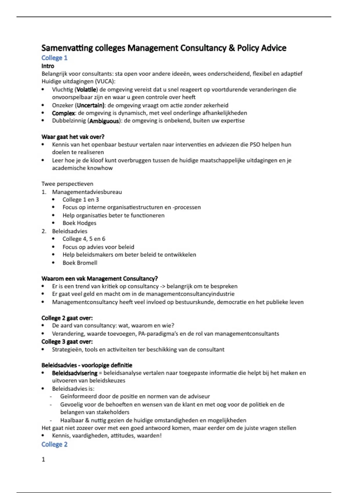 Samenvatting colleges Management Consultancy & Policy Advice