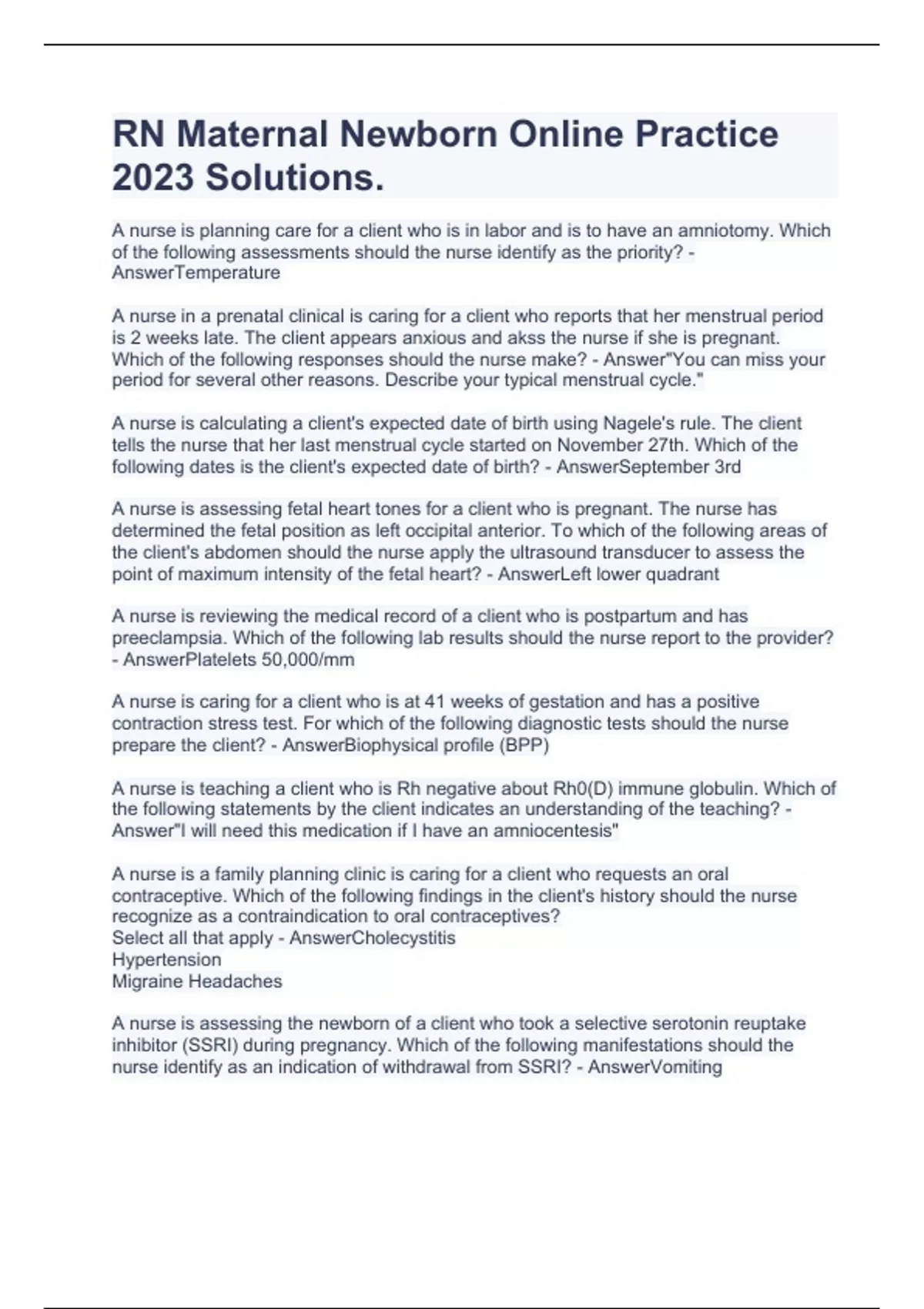 RN Maternal Newborn Online Practice 2023 Solutions.A nurse is planning care for a client who is in labor and is to have an amniotomy. Which of the following assessments should the nurse identify as the priority? - AnswerTemperature A nurse in a prenatal clinical is caring for a client who reports that her menstrual period is 2 weeks late. The client appears anxious and akss the nurse if she is pregnant. Which of the following responses should the nurse make? - Answer"You can miss your period for several other reasons. Describe your typical menstrual cycle." A nurse is calculating a client's expected date of birth using Nagele's rule. The client tells the nurse that her last menstrual cycle started on November 27th. Which of the following dates is the client's expected date of birth? - AnswerSeptember 3rd A nurse is assessing fetal heart tones for a client who is pregnant. The nurse has determined the fetal position as left occipital anterior. To which of the following areas of the client's abdomen should the nurse apply the ultrasound transducer to assess the point of maximum intensity of the fetal heart? - AnswerLeft lower quadrant A nurse is reviewing the medical record of a client who is postpartum and has preeclampsia. Which of the following lab results should the nurse report to the provider? - AnswerPlatelets 50,000/mm A nurse is caring for a client who is at 41 weeks of gestation and has a positive contraction stress test. For which of the following diagnostic tests should the nurse prepare the client? - AnswerBiophysical profile (BPP) A nurse is teaching a client who is Rh negative about Rh0(D) immune globulin. Which of the following statements by the client indicates an understanding of the teaching? - Answer"I will need this medication if I have an amniocentesis" A nurse is a family planning clinic is caring for a client who requests an oral contraceptive. Which of the following findings in the client's history should the nurse recognize as a contraindication to oral contraceptives? Select all that apply - AnswerCholecystitis Hypertension Migraine Headaches A nurse is assessing the newborn of a client who took a selective serotonin reuptake inhibitor (SSRI) during pregnancy. Which of the following manifestations should the nurse identify as an indication of withdrawal from SSRI? - AnswerVomiting