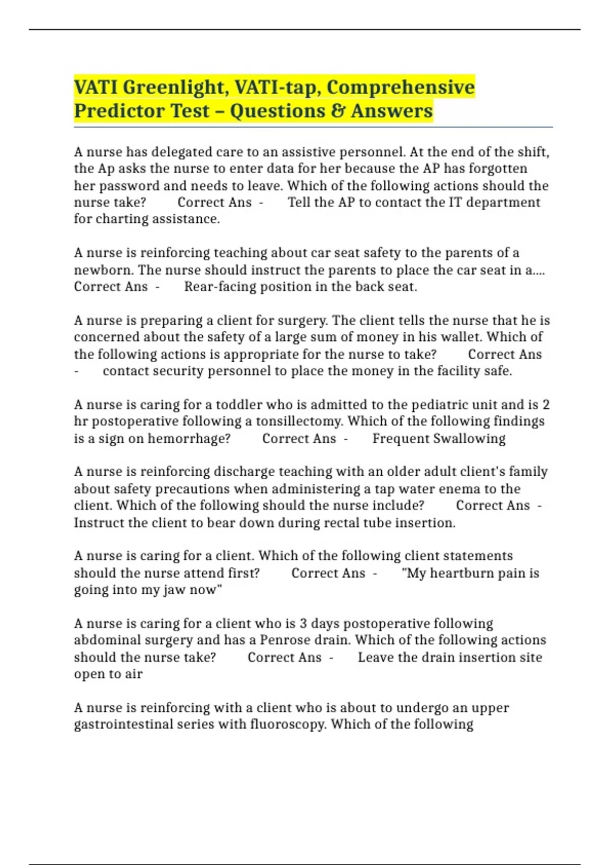 VATI Greenlight, VATI-tap, Comprehensive Predictor Test – Questions & Answers