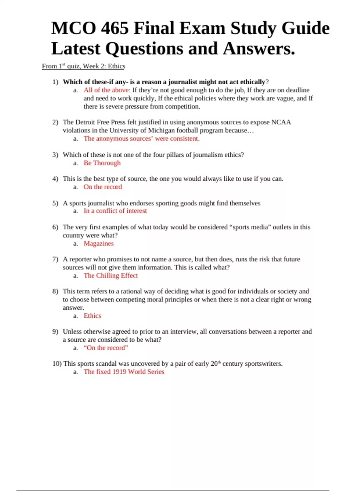 MCO 465 Final Exam Study Guide Latest Questions and Answers. From 1st quiz, Week 2: Ethics 1) Which of these-if any- is a reason a journalist might not act ethically? a. All of the above: If they’re not good enough to do the job, If they are on deadline and need to work quickly, If the ethical policies where they work are vague, and If there is severe pressure from competition. 2) The Detroit Free Press felt justified in using anonymous sources to expose NCAA violations in the University of Michigan football program because… a. The anonymous sources’ were consistent. 3) Which of these is not one of the four pillars of journalism ethics? a. Be Thorough 4) This is the best type of source, the one you would always like to use if you can. a. On the record 5) A sports journalist who endorses sporting goods might find themselves a. In a conflict of interest 6) The very first examples of what today would be considered “sports media” outlets in this country were what? a. Magazines 7) A reporter who promises to not name a source, but then does, runs the risk that future sources will not give them information. This is called what? a. The Chilling Effect 8) This term refers to a rational way of deciding what is good for individuals or society and to choose between competing moral principles or when there is not a clear right or wrong answer. a. Ethics 9) Unless otherwise agreed to prior to an interview, all conversations between a reporter and a source are considered to be what? a. “On the record” 10) This sports scandal was uncovered by a pair of early 20th century sportswriters. a. The fixed 1919 World Series MCO 465 Final Exam Study Guide Latest Questions and Answers. 11) Today it is common for sports journalists to report on professional athletes’ indiscretions. But during the 1920’s, that was not the case. Why? (Think of the Babe Ruth example) a. All of these answers are correct: Sports journalists did not perceive it to be part of their jobs. Sports journalists believed their job was to create heroes. Sports journalists believed if they printed the truth about athletes, readers would revolt and would no longer see a need for sports sections or sports reporters. 12) Which of these was a reason the all-sports newspaper the National failed? a. They couldn’t generate enough ad revenue and couldn’t get the paper out quickly. 13) This term refers to an individual’s code of behavior based on religious or philosophical principles, defining right and wrong in ways that may or may not be rational. a. Morals 14) The people who could potentially be impacted by your reporting, and whose feelings and motivations should be taken into account when coming to an ethical decision, are known collectively as what? a. Stakeholders 15) The front-page story about Alex Rodriguez of the Yankees possibly cheating on his wife ran contrary to what long-held unwritten rule about coverage of baseball players? a. That unless it impacts their play on the field, what they do off the field isn’t written about. 16) The number one thing that has fueled the growth of sports media in this country over time has been what? a. Money 17) The sensationalism of the early 20th century was so intense, there were calls-even among media personnel- for government-licensing. How was such licensing avoided? a. All of these answers are correct: Journalism schools opened, codes of ethics were drafted and adopted, and professional societies arose. 18) As long as sports and the media are intertwined in this way, their symbiotic relationship is likely to continue. a. Economically 19) We care that journalists act in an ethical manner and are honest because… a. It is a matter of trust 20) True or false: Print sports journalists in the 1980’s considered professionalism related issues to be the most serious problem facing their profession. a. True 21) True or False: According to a 2017 Reed and Harrison study, about 4 of every 7 trades discussed in NBA trade stories end up taking place. a. False Sports Media History This has been the number one driver behind the growth and rise of sports media in this country. o Money, sports are first and foremost a business. He launched the American Farmer magazine in 1819. o John Stuart Skinner; horseracing, fox hunting, fishing, and shooting The section added to the magazine in 1825 and devoted to sports was called… o “The sporting Olio” Eventually that section became its own magazine called….. o American Turf Register and Sporting Magazine William Trotter Porter started his own sporting magazine in 1831 called… o The Spirit of Times He was the first actual full-time sportswriter in American history and he also has a nickname that’s a bit of a misnomer. o This was an early tabloid that occasionally covered sports. o He started the first dedicated sports department at a daily American newspaper in 1883. What was the name of his newspaper and why do we know his name today? o Joseph Pulitzer; Pulitzer prize He started the first newspaper sports section in 1895. o William Randolph Hearst This was the biggest scandal of the early part of the 20th century and two sportswriters uncovered it. What was it and who were they? o The Black socks scandal; Ring Lardner and Hugh Fullerton When was “The Golden Age of Sports” and who were some of its stars? o The 1920’s; Babe Ruth, Jack Dempsey, Bill Tilden, and Red Grange The major sports media development of the “Roaring Twenties” was what? o The radio This was the first radio station in America, and broadcast the first official radio program. o KDKA Pittsburgh, Harold Arlin.