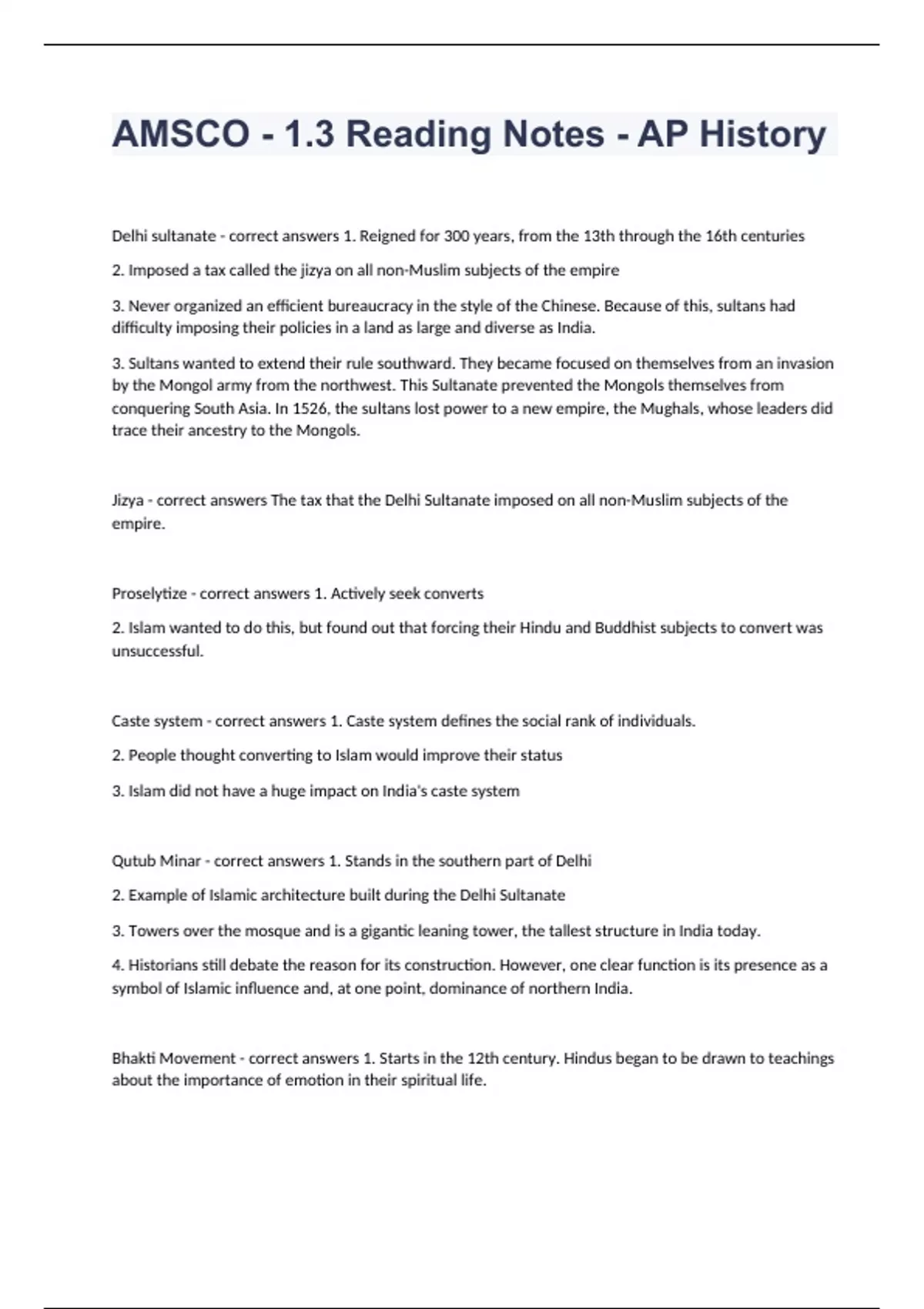 AMSCO - 1.3 Reading Notes - AP History Delhi sultanate - correct answers 1. Reigned for 300 years, from the 13th through the 16th centuries 2. Imposed a tax called the jizya on all non-Muslim subjects of the empire 3. Never organized an efficient bureaucracy in the style of the Chinese. Because of this, sultans had difficulty imposing their policies in a land as large and diverse as India. 3. Sultans wanted to extend their rule southward. They became focused on themselves from an invasion by the Mongol army from the northwest. This Sultanate prevented the Mongols themselves from conquering South Asia. In 1526, the sultans lost power to a new empire, the Mughals, whose leaders did trace their ancestry to the Mongols. Jizya - correct answers The tax that the Delhi Sultanate imposed on all non-Muslim subjects of the empire. Proselytize - correct answers 1. Actively seek converts 2. Islam wanted to do this, but found out that forcing their Hindu and Buddhist subjects to convert was unsuccessful. Caste system - correct answers 1. Caste system defines the social rank of individuals. 2. People thought converting to Islam would improve their status 3. Islam did not have a huge impact on India's caste system Qutub Minar - correct answers 1. Stands in the southern part of Delhi 2. Example of Islamic architecture built during the Delhi Sultanate 3. Towers over the mosque and is a gigantic leaning tower, the tallest structure in India today. 4. Historians still debate the reason for its construction. However, one clear function is its presence as a symbol of Islamic influence and, at one point, dominance of northern India. Bhakti Movement - correct answers 1. Starts in the 12th century. Hindus began to be drawn to teachings about the importance of emotion in their spiritual life. 2. They focused on developing a strong attachment to a particular deity instead of emphasizing on studying texts/performing rituals. 3. Began in southern India 4. Was especially appealing to a lot of believers because it didn't discriminate against women or people who held a lower social status. 5. Mira Bai: one of the most famous figures of this movement, female 6. The bhaktis were Hindus, but were similar to Sufi Muslims. 7. Sufi and bhaktis both were mystical movements, emphasized inner reflection in order to achieve a direct personal relationship with a deity. Each appealed to people outside their traditions because of how they didn't focus on the strict rules to traditional rituals and beliefs. 8. Bhaktis helped spread Hinduism. Angkor Wat - correct answers 1. Rulers of the Khmer Empire constructed the majestic Buddhist temple complex of this 2. Ruins of it still stand Most South Asians practiced which religions before the arrival of Islam? - correct answers Hinduism (large # of people) and Buddhism (small # of people) Summarize the main differences between Hinduism and Islam. - correct answers 1. Islam is monotheistic, while Hinduism is polytheistic (pray to many gods). 2. The artwork and temples of Hindu are replete with pictures of deities. Muslims disapprove of any visual representation of Allah. 3. Islam always calls for the equality of all believers. Hinduism was associated with a hierarchical caste system. 4. The Muslims look only to the Quran for spiritual guidance. Hindus use/recognize numerous sacred texts. The arrival of Islam was at first forceful, as Muslim rulers tried to force Hindu and Buddhist subjects to convert. This was unsuccessful, which led to voluntary conversion. Who voluntarily converted and why? - correct answers Islam emphasizes on the equality of all believers, so this attracted low-caste Hindus who hoped that conversion would improve their social status. The largest numbers of converts to Islam were Buddhists. Buddhism was left unorganized because of corruption among the monks and raids on monasteries by early Muslim conquerors.