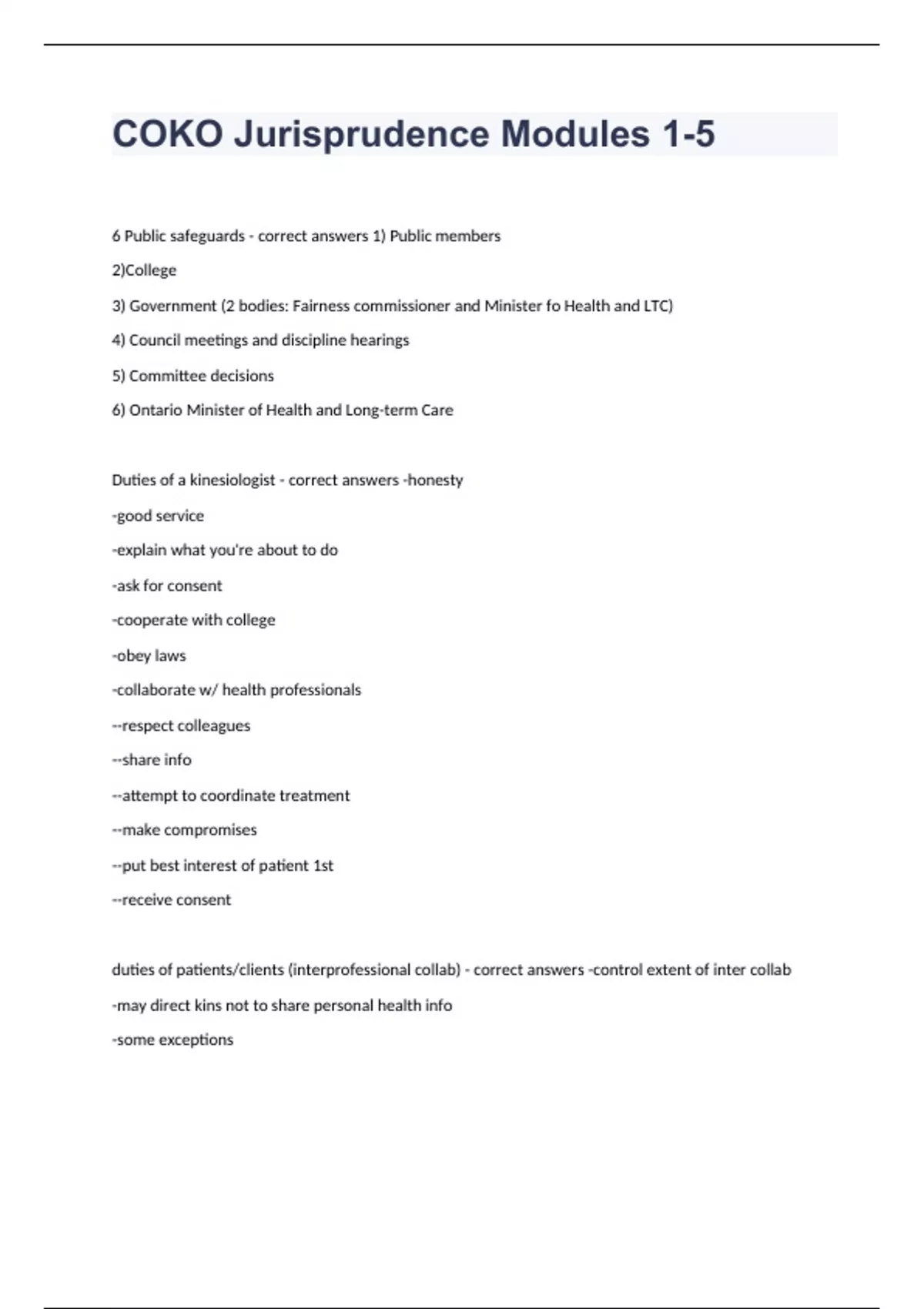 COKO Jurisprudence Modules 1-56 Public safeguards - correct answers 1) Public members 2)College 3) Government (2 bodies: Fairness commissioner and Minister fo Health and LTC) 4) Council meetings and discipline hearings 5) Committee decisions 6) Ontario Minister of Health and Long-term Care Duties of a kinesiologist - correct answers -honesty -good service -explain what you're about to do -ask for consent -cooperate with college -obey laws -collaborate w/ health professionals --respect colleagues --share info --attempt to coordinate treatment --make compromises --put best interest of patient 1st --receive consent duties of patients/clients (interprofessional collab) - correct answers -control extent of inter collab -may direct kins not to share personal health info -some exceptions Duties of COKO - correct answers -develop policies to ensure kins act honestly and competently -NOT to serve with self-interest (that's OKA) -NOT to set fees or advocate to government for kins -promote interprofessional collab -works w/ other health colleges by sharing info on investigations and developing standards to promote consistency -helps kin's collab RHPA - correct answers Regulated Health Professions Act -requires COKO to promote interprofessional collaboration OKA - correct answers Ontario Kinesologists Association -serve kins with self-interest Duties of council members - correct answers -loyalty and good faith -serve best interests of public Code of ethics - correct answers *takes precedence over codes of other orgs -be honest -respect confidentiality -treat ppl w/ sensitivity -maintain competence -enable patients to make informed choices Professional Standards - correct answers -help practice safely, ethically and competently -always changing professional misconduct - correct answers -conduct falls below expectations -e.g. practicing while not registered -consequences: --investigation by COKO leading to: ---discipline proceedings ---fines ---suspension/revocation of registration incompetence - correct answers -serious lack of knowledge, skill or judgement when assessing/treating incapacity - correct answers -health condition preventing clear thinking and safe practice -investigated by COKO and then Fitness to Practice Committee *not professional misconduct Informed consent - correct answers an ethical principle that research patients be told enough to enable them to choose whether they wish to participate in the assessment/treatment *must be received or face criminal, civil or professional conseqs effective communication - correct answers -listening -asking clarifying qs -clearly expressing what you are going to do, why and what is likely to happen effective communication is important for 4 reasons: - correct answers 1)Informed consent 2)Boundaries and sexual abuse 3) Interprofessional collaboration 4) Billing 4 criteria for valid consent (FIVS) - correct answers FACTUAL: -no false claims, would be misrepresentation or fraud INFORMED: -explain everything they need to know before asking for consent
