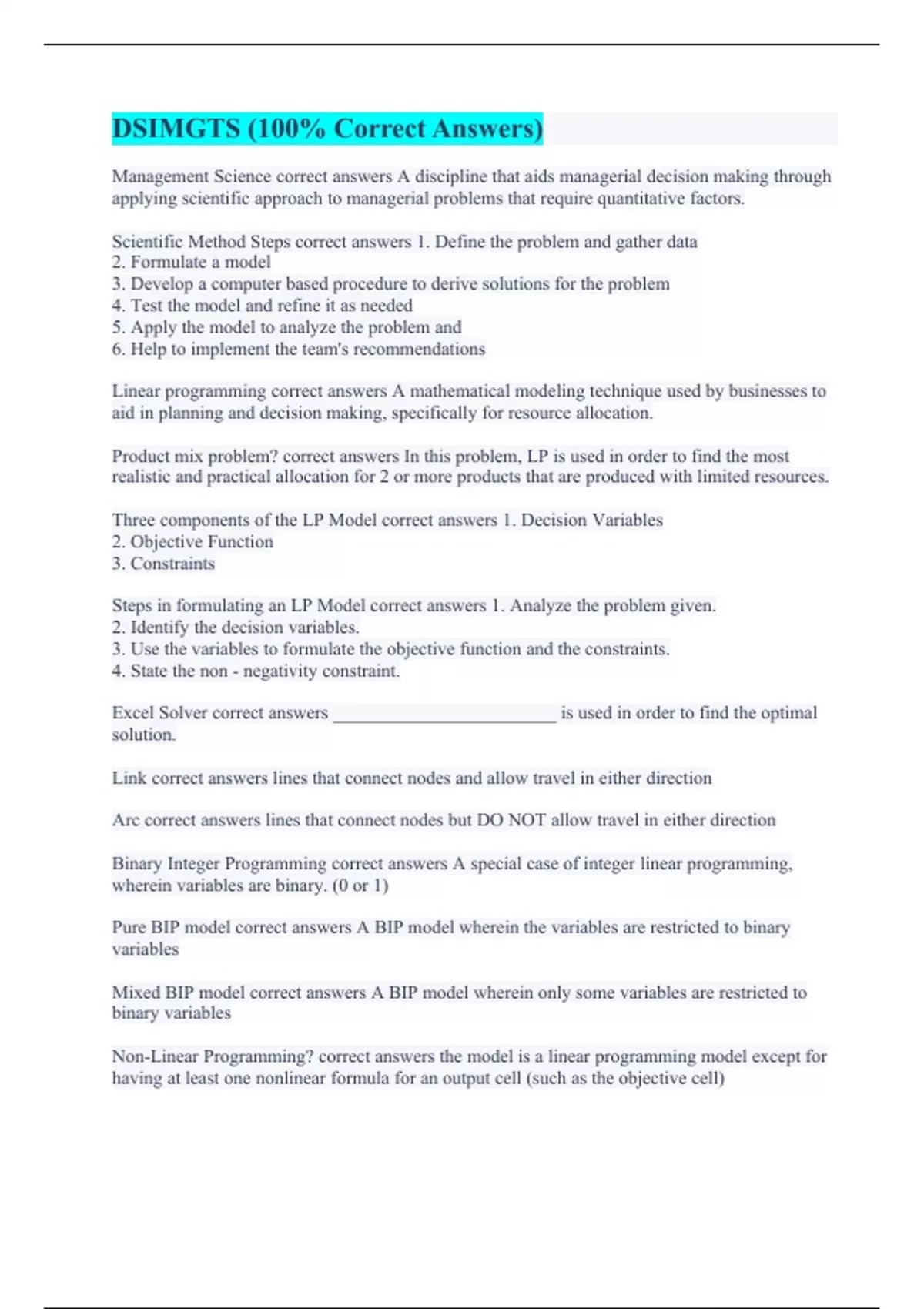 Management Science correct answers A discipline that aids managerial decision making through applying scientific approach to managerial problems that require quantitative factors. Scientific Method Steps correct answers 1. Define the problem and gather data 2. Formulate a model 3. Develop a computer based procedure to derive solutions for the problem 4. Test the model and refine it as needed 5. Apply the model to analyze the problem and 6. Help to implement the team's recommendations Linear programming correct answers A mathematical modeling technique used by businesses to aid in planning and decision making, specifically for resource allocation. Product mix problem? correct answers In this problem, LP is used in order to find the most realistic and practical allocation for 2 or more products that are produced with limited resources. Three components of the LP Model correct answers 1. Decision Variables 2. Objective Function 3. Constraints Steps in formulating an LP Model correct answers 1. Analyze the problem given. 2. Identify the decision variables. 3. Use the variables to formulate the objective function and the constraints. 4. State the non - negativity constraint. Excel Solver correct answers ________________________ is used in order to find the optimal solution. Link correct answers lines that connect nodes and allow travel in either direction Arc correct answers lines that connect nodes but DO NOT allow travel in either direction Binary Integer Programming correct answers A special case of integer linear programming, wherein variables are binary. (0 or 1) Pure BIP model correct answers A BIP model wherein the variables are restricted to binary variables Mixed BIP model correct answers A BIP model wherein only some variables are restricted to binary variables Non-Linear Programming? correct answers the model is a linear programming model except for having at least one nonlinear formula for an output cell (such as the objective cell)