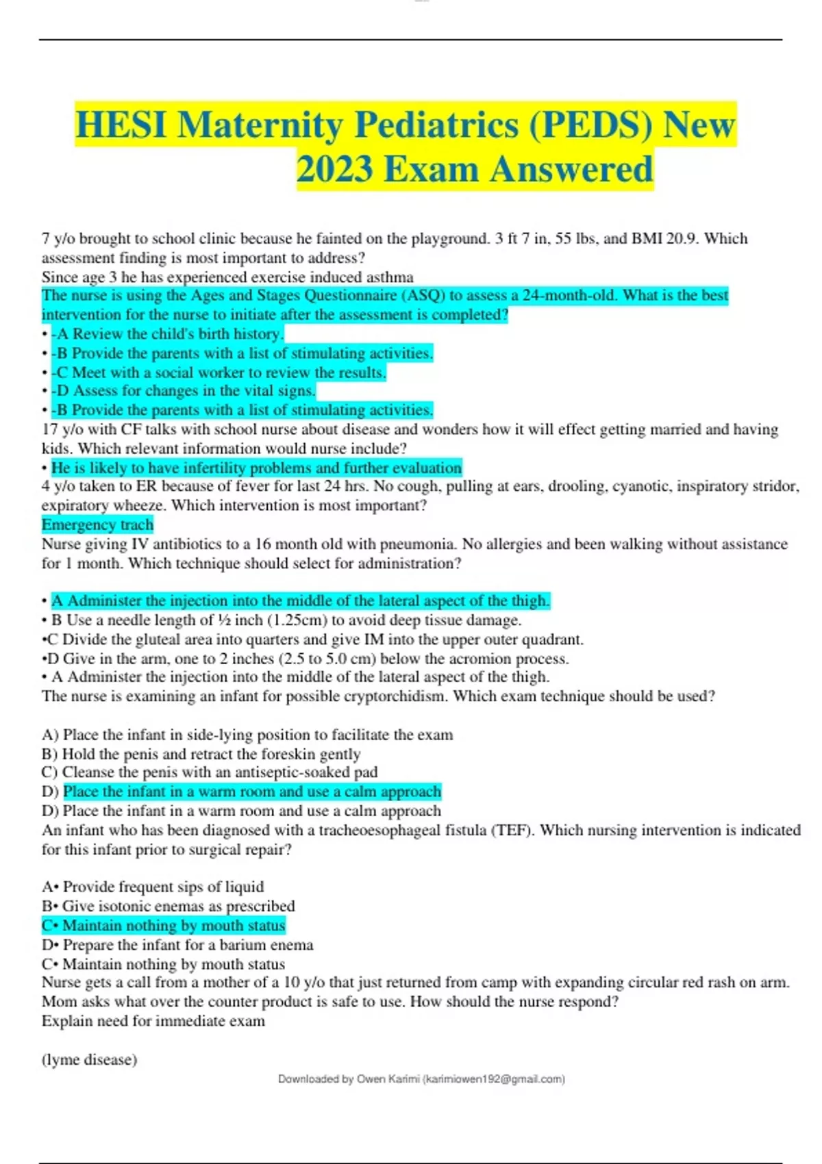 HESI Maternity Pediatrics (PEDS) New 2023 Exam Answered 7 y/o brought to school clinic because he fainted on the playground. 3 ft 7 in, 55 lbs, and BMI 20.9. Which assessment finding is most important to address? Since age 3 he has experienced exercise induced asthma The nurse is using the Ages and Stages Questionnaire (ASQ) to assess a 24-month-old. What is the best intervention for the nurse to initiate after the assessment is completed? • -A Review the child's birth history. • -B Provide the parents with a list of stimulating activities. • -C Meet with a social worker to review the results. • -D Assess for changes in the vital signs. • -B Provide the parents with a list of stimulating activities. 17 y/o with CF talks with school nurse about disease and wonders how it will effect getting married and having kids. Which relevant information would nurse include? • He is likely to have infertility problems and further evaluation 4 y/o taken to ER because of fever for last 24 hrs. No cough, pulling at ears, drooling, cyanotic, inspiratory stridor, expiratory wheeze. Which intervention is most important? Emergency trach Nurse giving IV antibiotics to a 16 month old with pneumonia. No allergies and been walking without assistance for 1 month. Which technique should select for administration? • A Administer the injection into the middle of the lateral aspect of the thigh. • B Use a needle length of ½ inch (1.25cm) to avoid deep tissue damage. •C Divide the gluteal area into quarters and give IM into the upper outer quadrant. •D Give in the arm, one to 2 inches (2.5 to 5.0 cm) below the acromion process. • A Administer the injection into the middle of the lateral aspect of the thigh. The nurse is examining an infant for possible cryptorchidism. Which exam technique should be used? A) Place the infant in side-lying position to facilitate the exam B) Hold the penis and retract the foreskin gently C) Cleanse the penis with an antiseptic-soaked pad D) Place the infant in a warm room and use a calm approach D) Place the infant in a warm room and use a calm approach An infant who has been diagnosed with a tracheoesophageal fistula (TEF). Which nursing intervention is indicated for this infant prior to surgical repair? A• Provide frequent sips of liquid B• Give isotonic enemas as prescribed C• Maintain nothing by mouth status D• Prepare the infant for a barium enema C• Maintain nothing by mouth status Nurse gets a call from a mother of a 10 y/o that just returned from camp with expanding circular red rash on arm. Mom asks what over the counter product is safe to use. How should the nurse respond? Explain need for immediate exam (lyme disease) What nutritional info to provide mom of a 6-month old regarding solid food? Initiate one at a time in 4-7 day intervals A child with hemophilia arrives at the clinic with a swollen knee after falling off a bicycle. What action should the nurse implement first? A• Initiate an IV site and begin infusing normal saline• Type and cross for possible transfusion B• Monitor the child's vital signs frequently C• Apply ice pack and compression dressing to knee C• Apply ice pack and compression dressing to knee A breast feeding mother returns to work when her infant is 5 months old. She is having difficulty pumping enough milk to meet her infant's dietary requirements. Which suggestion should the nurse provide to this mother? A• Mix infant formula with breast milk B• Supplement with an iron-rich formula C• Introduce baby food for one meal daily D• Offer a follow-up transitional formula B• Supplement with an iron-rich formula