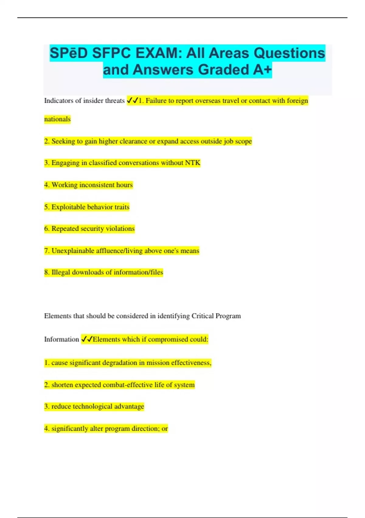 SPēD SFPC EXAM: All Areas Questions and Answers Graded A+ Indicators of insider threats 1. Failure to report overseas travel or contact with foreign nationals 2. Seeking to gain higher clearance or expand access outside job scope 3. Engaging in classified conversations without NTK 4. Working inconsistent hours 5. Exploitable behavior traits 6. Repeated security violations 7. Unexplainable affluence/living above one's means 8. Illegal downloads of information/files Elements that should be considered in identifying Critical Program Information Elements which if compromised could: 1. cause significant degradation in mission effectiveness, 2. shorten expected combat-effective life of system 3. reduce technological advantage 4. significantly alter program direction; or 5. enable adversary to defeat, counter, copy, or reverse engineer technology/capability. Elements that security professional should consider when assessing and managing risks to DoD assets (risk management process) 1. Assess assets 2. Assess threats 3. Assess Vulnerabilities 4. Assess risks 5. Determine countermeasure options 6. Make RM decision The three categories of Special Access Programs acquisition, intelligence, and operations & support Types of threats to classified information Insider Threat, Foreign Intelligence Entities (FIE), criminal activities, cyber threats, business competitors The concept of an insider threat An employee who may represent a threat to national security. These threats encompass potential espionage, violent acts against the Government or the nation, and unauthorized disclosure of classified information The purpose of the Foreign Visitor Program To track and approve access by a foreign entity to information that is classified; and to approve access by a foreign entity to information that is unclassified, related to a U.S. Government contract, or plant visits covered by ITAR. Special Access Program A program established for a specific class of classified information that imposes safeguarding and access requirements that exceed those normally required for information at the same classification level. Enhanced security requirements for protecting Special Access Program (SAP) information Within Personnel Security: • Access Rosters; • Billet Structures (if required); • Indoctrination Agreement; • Clearance based on appropriate investigation completed within last 5/6 years; • Individual must materially contribute to program and have need to know (NTK); • SAP personnel subject to random counterintelligence scope polygraph; • Polygraph examination, if approved by the DepSecDef, may be used as a mandatory access determination; • Tier review process; • Personnel must have Secret or TS clearance; • SF-86 must be current within one year; • Limited Access; • Waivers required for foreign cohabitants, spouses, and immediate family members. Within Industrial Security: The