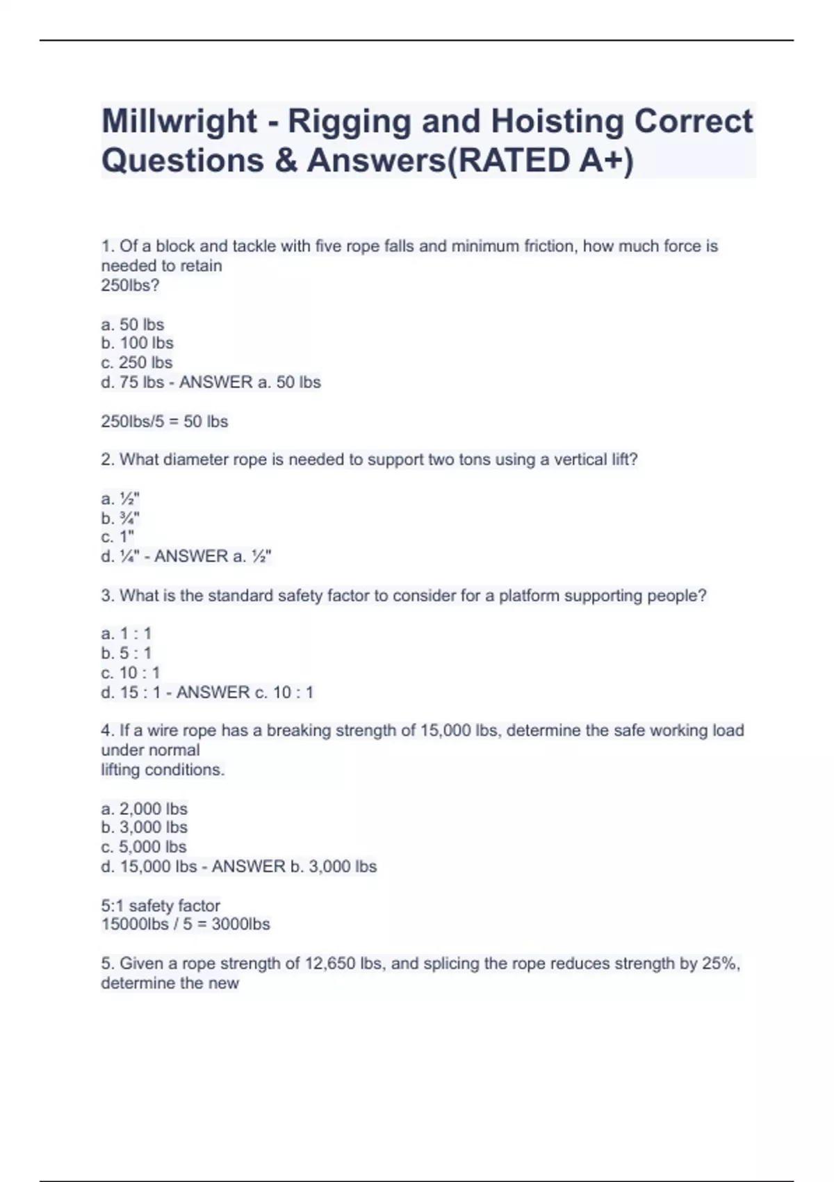 1. Of a block and tackle with five rope falls and minimum friction, how much force is needed to retain 250lbs? a. 50 lbs b. 100 lbs c. 250 lbs d. 75 lbs - ANSWER a. 50 lbs 250lbs/5 = 50 lbs 2. What diameter rope is needed to support two tons using a vertical lift? a. ½" b. ¾" c. 1" d. ¼" - ANSWER a. ½" 3. What is the standard safety factor to consider for a platform supporting people? a. 1 : 1 b. 5 : 1 c. 10 : 1 d. 15 : 1 - ANSWER c. 10 : 1 4. If a wire rope has a breaking strength of 15,000 lbs, determine the safe working load under normal lifting conditions. a. 2,000 lbs b. 3,000 lbs c. 5,000 lbs d. 15,000 lbs - ANSWER b. 3,000 lbs 5:1 safety factor 15000lbs / 5 = 3000lbs 5. Given a rope strength of 12,650 lbs, and splicing the rope reduces strength by 25%, determine the new rope strength for normal rigging conditions. a. 1897.5 lbs b. 948.75 lbs c. 1000 lbs d. 2300 lbs - ANSWER a. 1897.5 lbs [12650 lbs/5(safety factor)] x 0.75 =1897.5 lbs 6. What type of lifting technique has the least lifting capacity (if all use the same rope)? a. Basket hitch
