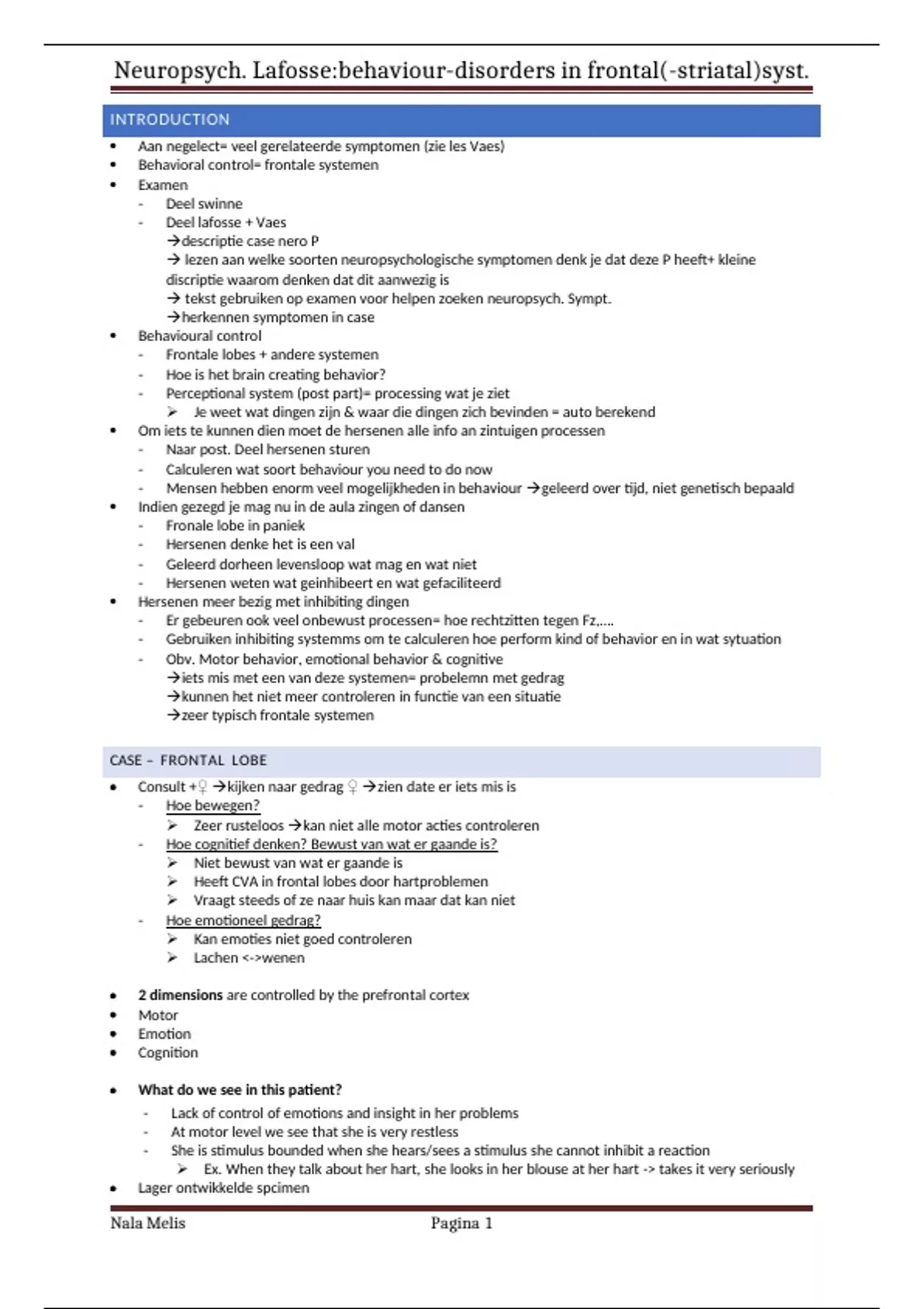 Samenvatting van het vak clinical neuropsychology deel fronto-striatal systeem gegeven door prof. Lafosse. De samenvatting bevat zowel de info van de powerpoint als extra bijgeschreven notities. Mits de slides in het Engels zijn is het een mengeling van Engels (slides) en Nederlands (eigen notities). Alles staat in puntjes dus een volledige alinea's