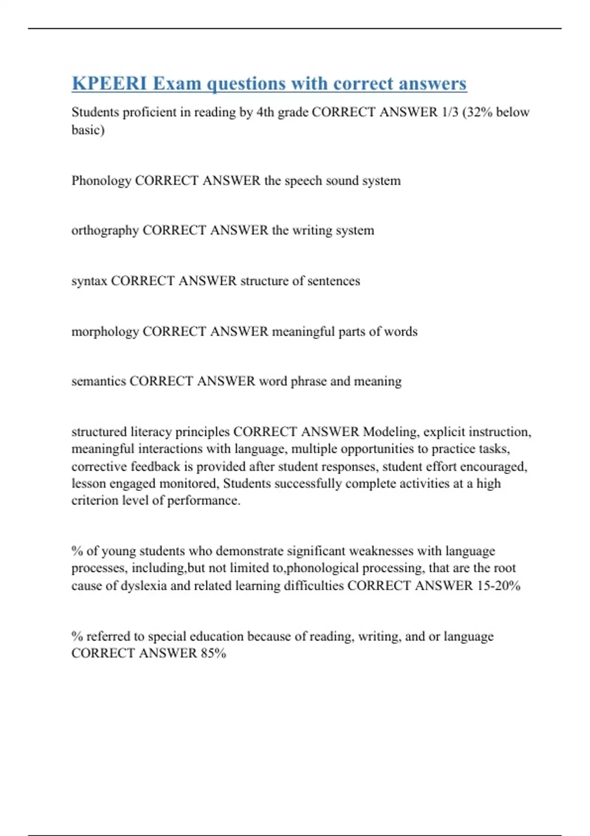 Students proficient in reading by 4th grade CORRECT ANSWER 1/3 (32% below basic) Phonology CORRECT ANSWER the speech sound system orthography CORRECT ANSWER the writing system syntax CORRECT ANSWER structure of sentences morphology CORRECT ANSWER meaningful parts of words semantics CORRECT ANSWER word phrase and meaning structured literacy principles CORRECT ANSWER Modeling, explicit instruction, meaningful interactions with language, multiple opportunities to practice tasks, corrective feedback is provided after student responses, student effort encouraged, lesson engaged monitored, Students successfully complete activities at a high criterion level of performance. % of young students who demonstrate significant weaknesses with language processes, including,but not limited to,phonological processing, that are the root cause of dyslexia and related learning difficulties CORRECT ANSWER 15-20% % referred to special education because of reading, writing, and or language CORRECT ANSWER 85%