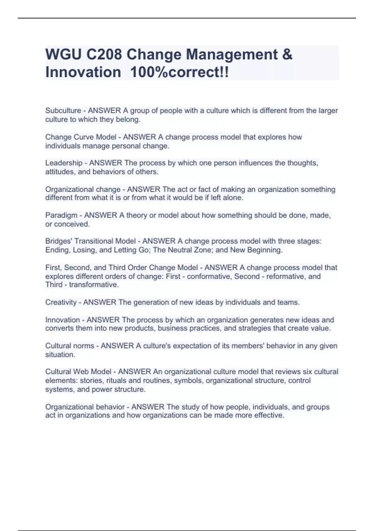 wgu c208 change management innovation 100corre