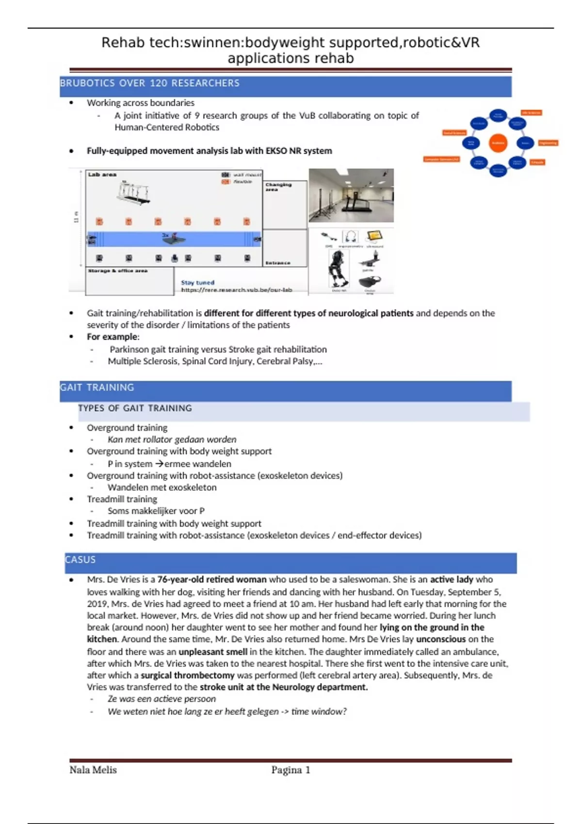Samenvatting van de les body weight supported, robotic & VR during gait rehab gegeven door prof E. Swinnen van het vak rehab technology. Het is een samenvatting van de slides van de powerpoint en extra genoteerde items van tijdens de les. De slides waren in het Engels en mijn eigen notities zijn steeds zoveel mogelijk in het Nederlands. Het is dus een mix van de 2 talen doordat het een Engelstalige master is. Alles staat in puntjes dus geen volledige alinea's