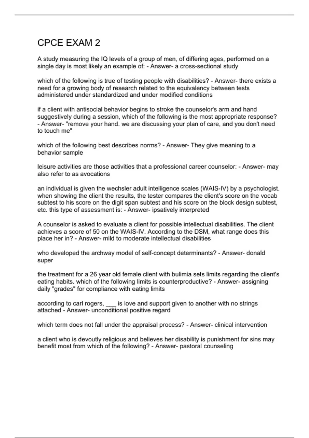 A study measuring the IQ levels of a group of men, of differing ages, performed on a single day is most likely an example of: - Answer- a cross-sectional study which of the following is true of testing people with disabilities? - Answer- there exists a need for a growing body of research related to the equivalency between tests administered under standardized and under modified conditions if a client with antisocial behavior begins to stroke the counselor's arm and hand suggestively during a session, which of the following is the most appropriate response? - Answer- "remove your hand. we are discussing your plan of care, and you don't need to touch me" which of the following best describes norms? - Answer- They give meaning to a behavior sample leisure activities are those activities that a professional career counselor: - Answer- may also refer to as avocations an individual is given the wechsler adult intelligence scales (WAIS-IV) by a psychologist. when showing the client the results, the tester compares the client's score on the vocab subtest to his score on the digit span subtest and his score on the block design subtest, etc. this type of assessment is: - Answer- ipsatively interpreted A counselor is asked to evaluate a client for possible intellectual disabilities. The client achieves a score of 50 on the WAIS-IV. According to the DSM, what range does this place her in? - Answer- mild to moderate intellectual disabilities who developed the archway model of self-concept determinants? - Answer- donald super the treatment for a 26 year old female client with bulimia sets limits regarding the client's eating habits. which of the following limits is counterproductive? - Answer- assigning daily "grades" for compliance with eating limits according to carl rogers, ___ is love and support given to another with no strings attached - Answer- unconditional positive regard which term does not fall under the appraisal process? - Answer- clinical intervention a cli