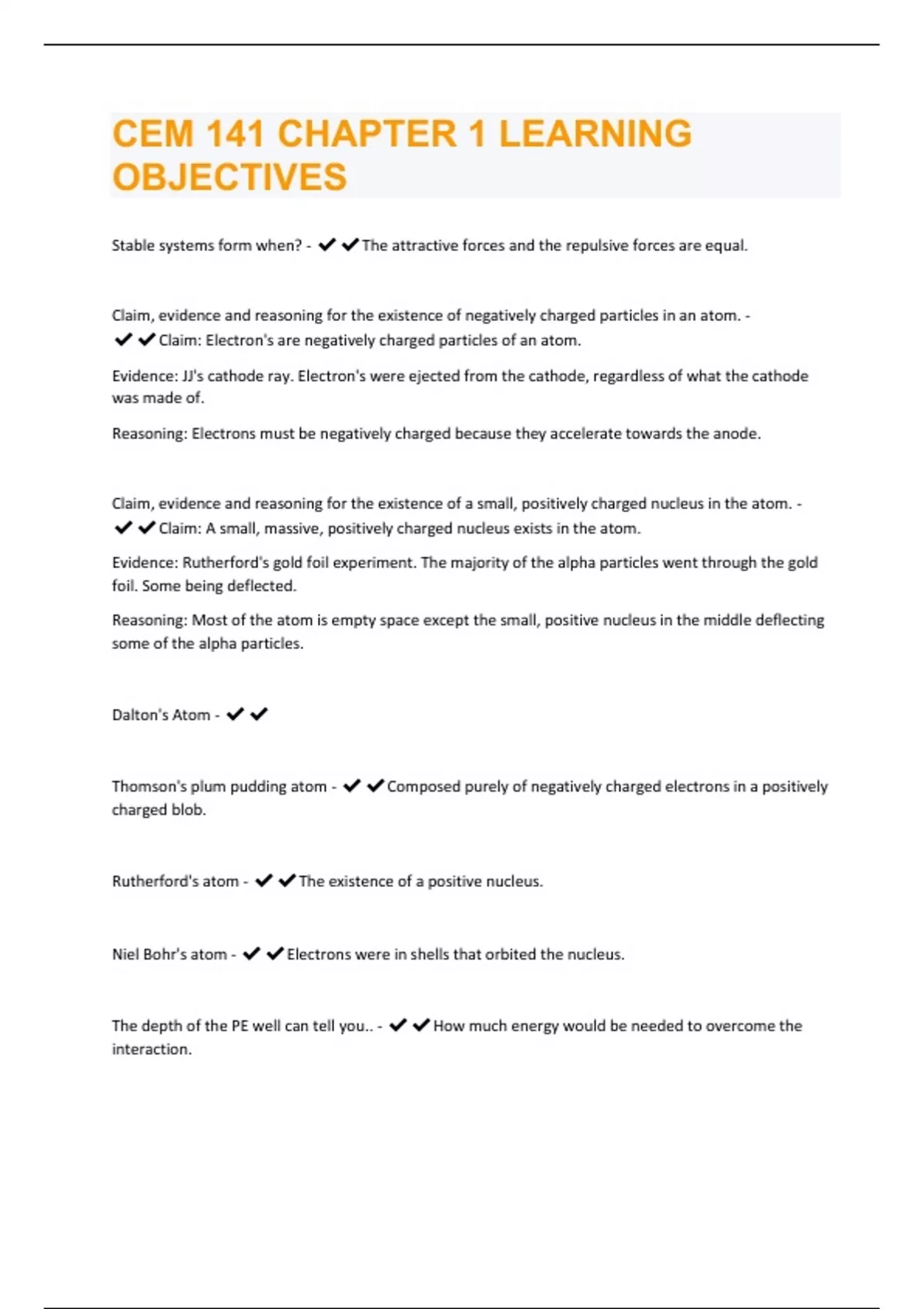 CEM 141 CHAPTER 1 LEARNING OBJECTIVES QUESTIONS WITH A GUARANTEED A+