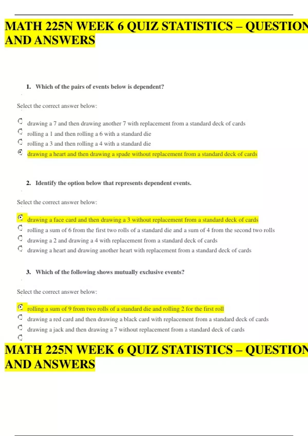 MATH 225N WEEK 6 QUIZ STATISTICS – QUESTION AND ANSWERS