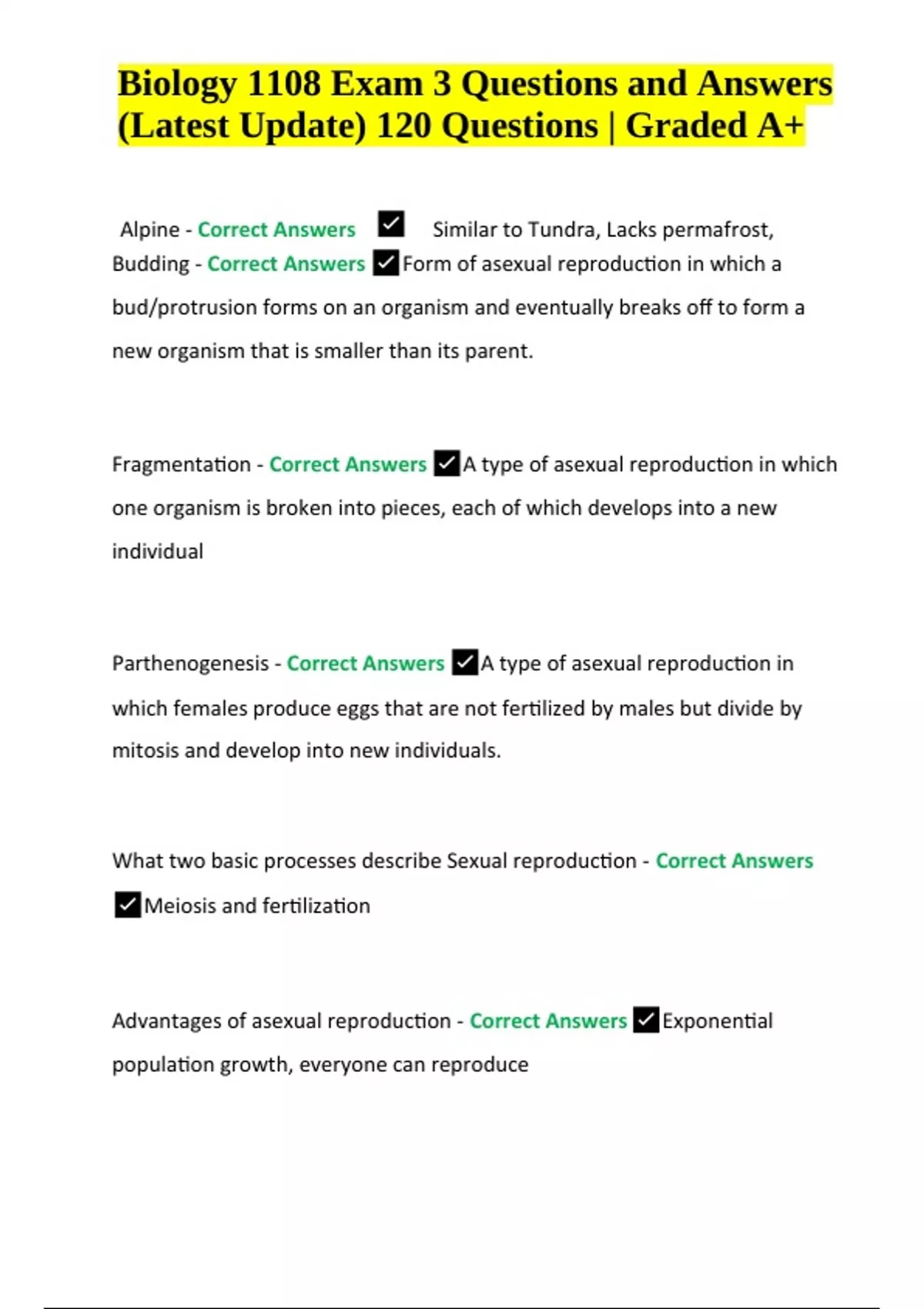 Biology 1108 Exam 3 Questions and Answers Latest Update 2024 Graded A+. Alpine - Correct Answers Similar to Tundra, Lacks permafrost, Budding - Correct Answers Form of asexual reproduction in which a bud/protrusion forms on an organism and eventually breaks off to form a new organism that is smaller than its parent. Fragmentation - Correct Answers A type of asexual reproduction in which one organism is broken into pieces, each of which develops into a new individual Parthenogenesis - Correct Answers A type of asexual reproduction in which females produce eggs that are not fertilized by males but divide by mitosis and develop into new individuals. What two basic processes describe Sexual reproduction - Correct Answers Meiosis and fertilization Advantages of asexual reproduction - Correct Answers Exponential population growth, everyone can reproduce Biology 1108 Exam 3 Questions and Answers (Latest Update) 120 Questions | Graded A+ External Fertilization - Correct Answers Egg and sperm released directly into the water. Low chances, but countered by producing large numbers of gametes, or other strategies Internal Fertilization - Correct Answers Fertilization takes place inside the body of the female. Considered an adaption for land animals R-Strategists - Correct Answers organisms that produce large numbers of offspring without a lot of parental investment. Mainly found in unstable changing environments. K-Strategists - Correct Answers organisms that produce few offspring but put in a lot of parental investment. Mainly found in stable environments where there is lots of competition. Amnion - Correct Answers a membrane surrounding a fluid filled cavity that allows the embryo to develop in a watery environment. Huge impact on animals abilities to reproduce w/o water. Allantois - Correct Answers Encloses a space within the egg where metabolic waste collects Chorion - Correct Answers surrounds the entire embryo along with its yolk and allantoic sac. Limits water loss and allows has exchange within environment. Cleavage - Correct Answers First set of mitotic division after fertilization of zygote. Single large egg divides into many smaller cells. Morula - Correct Answers A solid ball of cells that results from cleavage Blastula - Correct Answers Further cell divisions after the morula result in the blastula, a fluid filled ball of cells. Marks the beginning of implantation into the uterine lining. Pregnancy - Correct Answers The carrying of one or more embryos in the uterus Biology 1108 Exam 3 Questions and Answers (Latest Update 2023) 120 Questions First Trimester - Correct Answers Embryo develops all of its major organs and becomes recognizably human. becomes a fetus toward the end of the first trimester Gastrulation - Correct Answers The second key developmental process in embryogenesis. The reorganization of the embryo. Form three layers of sheets of cells called germ layers. All tissues and organs are made from these three layers. Three Germ Layers - Correct Answers Outer Ectoderm, Intermediate mesoderm, and inner endoderm Organogenesis - Correct Answers the transformation of the three germ layers into all the organ systems of the body. Sex Determination - Correct Answers achieved by absence or presence of Y Chromosome Biology 1108 Exam 3 Questions and Answers (Latest Update 2023) 120 Questions 2nd Trimesters - Correct Answers Characterized by continued development and growth of the fetus. Fetal movements are usually first felt in this stage. 3rd Trimester - Correct Answers Rapid growth, fetus doubles in size during the last two months.