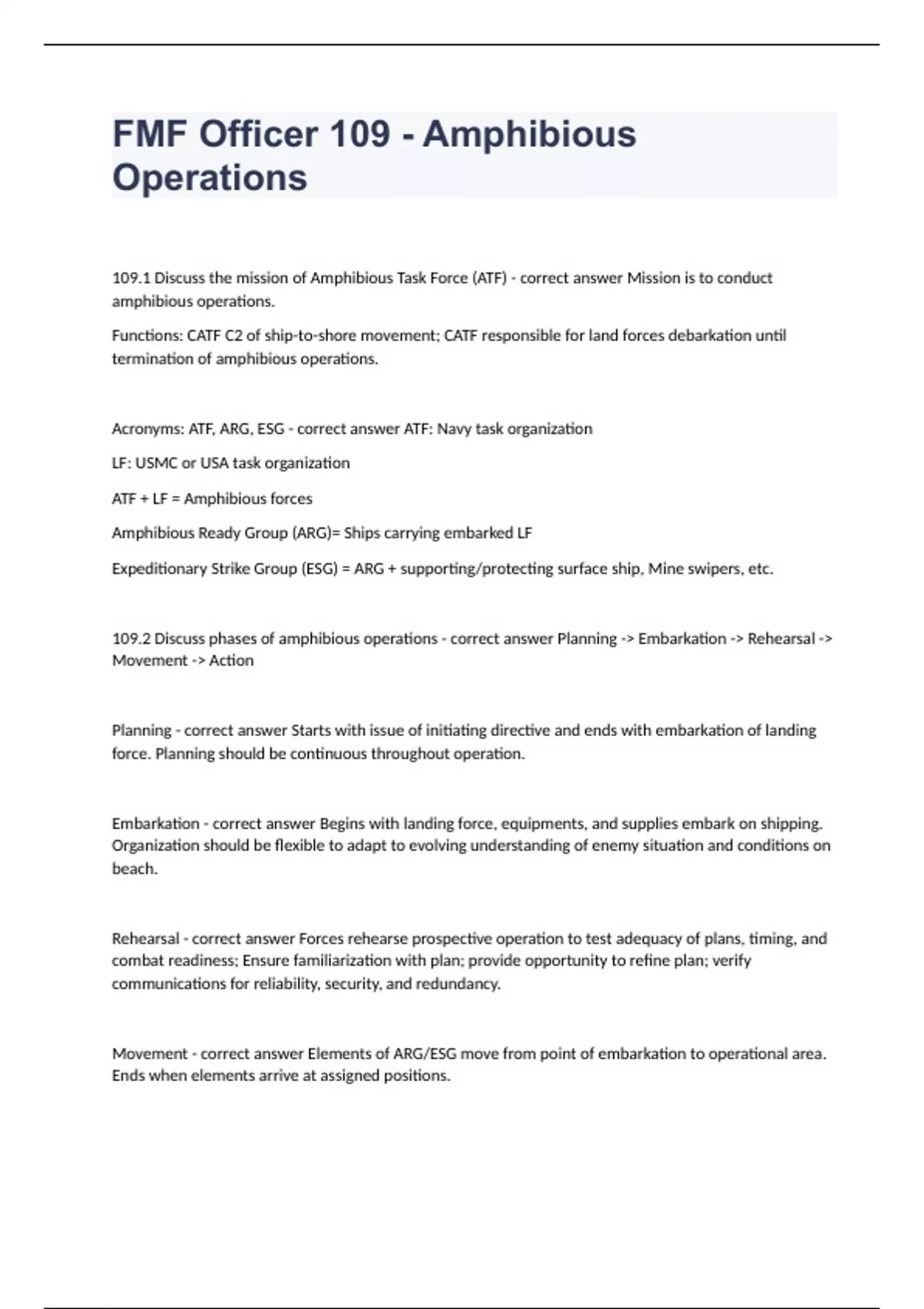 FMF Officer 109 - Amphibious Operations well answered graded A+