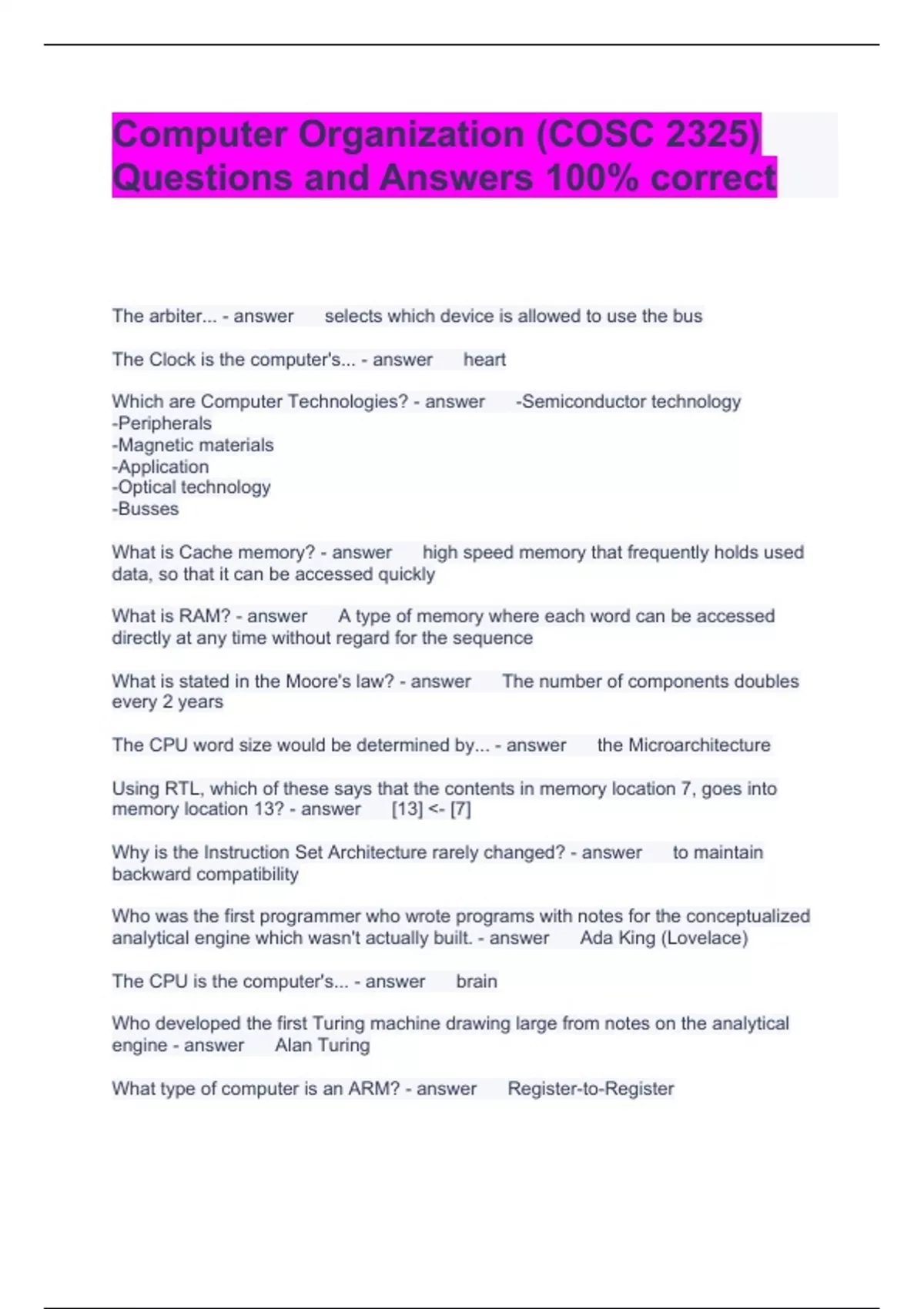 Computer Organization (COSC 2325) Questions and Answers 100% correct The arbiter... selects which device is allowed to use the bus The Clock is the computer's... heart Which are Computer Technologies? -Semiconductor technology -Peripherals -Magnetic materials -Application -Optical technology -Busses What is Cache memory? high speed memory that frequently holds used data, so that it can be accessed quickly What is RAM? A type of memory where each word can be accessed directly at any time without regard for the sequence What is stated in the Moore's law? The number of components doubles every 2 years The CPU word size would be determined by... the Microarchitecture Using RTL, which of these says that the contents in memory location 7, goes into memory location 13? [13] <- [7] Why is the Instruction Set Architecture rarely changed? to maintain backward compatibility Who was the first programmer who wrote programs with notes for the conceptualized analytical engine which wasn't actually built. Ada King (Lovelace) The CPU is the computer's... brain Who developed the first Turing machine drawing large from notes on the analytical engine Alan Turing What type of computer is an ARM? Register-to-Register What is the Microarchitecture of the computer? It is the architecture of the internal design of the computer Which are factors affecting the computer designer? -Technology -Architecture -Organization -Applications -System What does the term CISC and RISC mean? Complex Instruction Set Computer and Reduced Instruction Set Computer The computers that had components with moving parts which are controlled electrically are called? Electromechanical The analytical engine was designed by: Charles Babbage According to the book (NOT the video), how long does Moore's Law say it takes the number of components on an integrated circuit to double? 24 months What is Register? a memory element on the CPU chip What is DRAM? Dynamic random access memory Microarchitecture describes... the computer's organization What is the computer that lies at the heart of systems ranging from the personal computer to a cell phone? Von Neumann stored program digital computer How many words does a Register have? 1 Which of these are classes of Computer? -neural -quantum -biochemical -analog What are the two parts of a floating point number? The significand and the exponent A sequential logical element... is a circuit that depends on it's past history as well as it's current inputs What determines what a group of bits in a computer means? The architecture of the microprocessor Assuming 1=true and 0=false; NOT ((1 AND 0) OR 1) is... False Two's complement require separate adders and subtractors False In regard to floating point numbers, what is the "significand"? The part of a number consisting of its significant digits What is the maximum value of an unsigned 8-bit number? 255 In 64-bit arithmetic; if n=5, then 2^8 - 5 is the... two's compliment value for n Sign and Magnitude, two's compliment, and biased representation are all ways of dealing with... signed numbers A(n) __________ is the basic unit of information operated on by a computer. word There are 5 parts to computers. The processor is made up of 2 parts. Which ones? Control and ALU Sign and Magnitude signed numbers require seperate adders and subtractors True What is NaN? Not a number A combinational logical element... is a circuit whose output depend only on it's input What does the acronym bit stand for? Binary Digit The __________ of a number is difference between it's representation and it's actual value. accuracy How many states can 7 bits represent? 128 ( XOR ) is... Digital computers store their memory in groups called... words A word with n bits can represent how many possible values? 2^n What is the "old school" name for the "significand"? mantissa What did some computers in the 1970s use instead of retgisters? A group of memory locations When does "Stack Allocation" make all bindings? at compile time Which is true? Becuase the stack grows towards the low end of memory, the stack pointer is documented to create a stack frame Sometimes registers have to hold data shorter than their actual lengths. So, what happens to the extra bits? -Some processors extend the bits to the full length of the word -Some processors leave the unused bits unchanged -Some processors set the unused bits to 0 In the Register Indirect, or pointer based, or indexed addressing mode... A register contains the address of the operand Storage must be allocated at runtime because... the amount of storage required changes as the program is executed What is R-13 reserved to use for? A stack pointer In the Literal, or immediate, addressing mode... The Actual value is part of the instruction Given that registers do not do any computing, or logic operations, why are they necessary? To achieve higher performance levels In general, operations on the stack frame are balanced; that means... if you put something on the stack frame you have to remove it When it comes down to the ISA, what is conceptually the most useless part of the computer? The register The main importance of ARM micro-processors is providing operation with __________ Low cost and low power consumption Exceptions are raised in response to internal hardware or software errors or by... peripherals seeking attention Which is true? The stack pointer always points to the top of the stack, the frame pointer points to the base of the current stack frame, the stack pointer may change during the execution of the current procedure, but the frame pointer will not change When you pass by value you need to be careful not to unintentionally change the value of the variable. False What is probably the most fundamentally important data structure in computer science? The Stack What is the command to put the value at memory location 1234 into register 1? LDR r1, 1234 What are the three elements of an ISA? -register set -instruction formats -addressing modes 