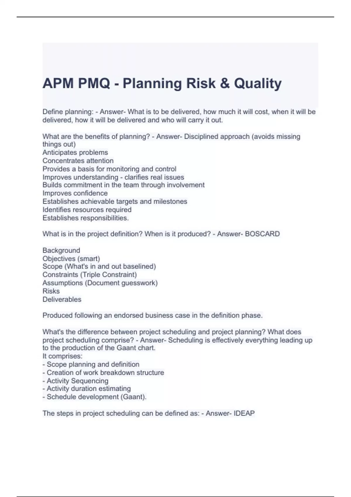 APM PMQ - Planning Risk & Quality Exam with correct Answers