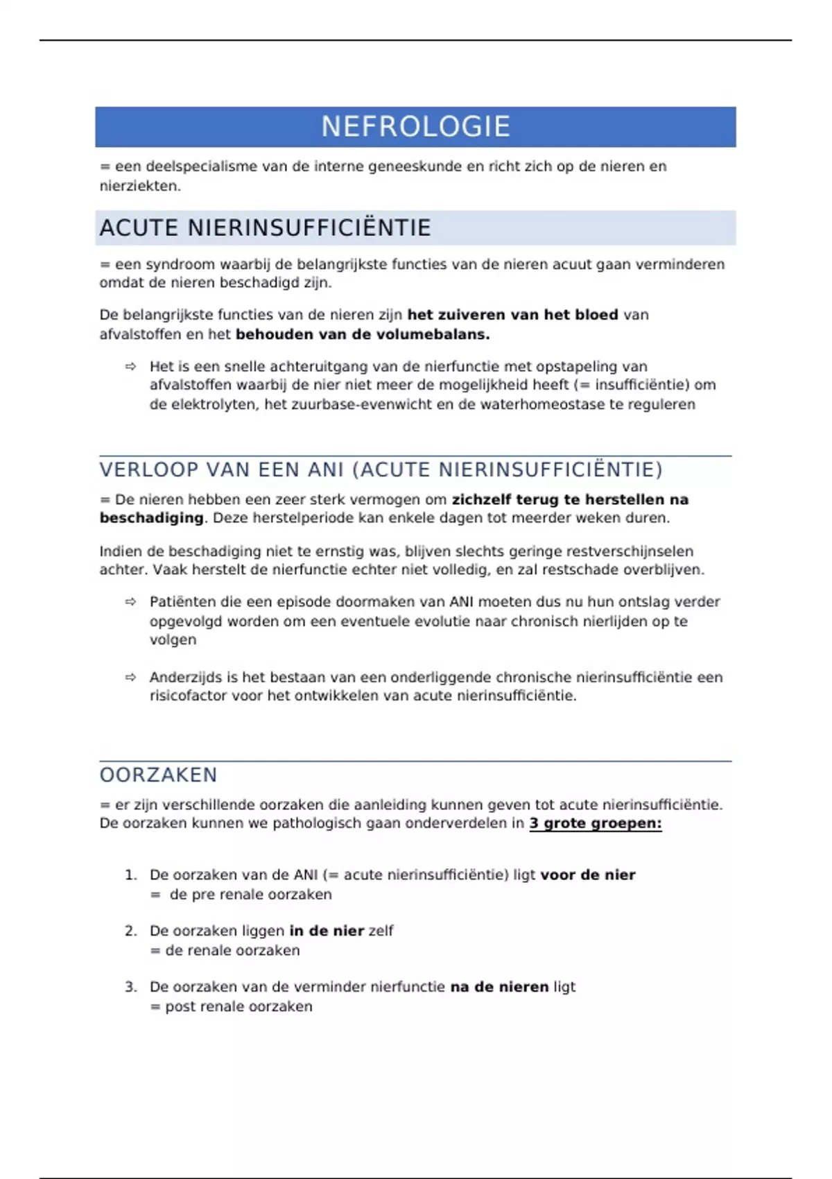 1. De oorzaken van de ANI (= acute nierinsufficiëntie) ligt voor de nier