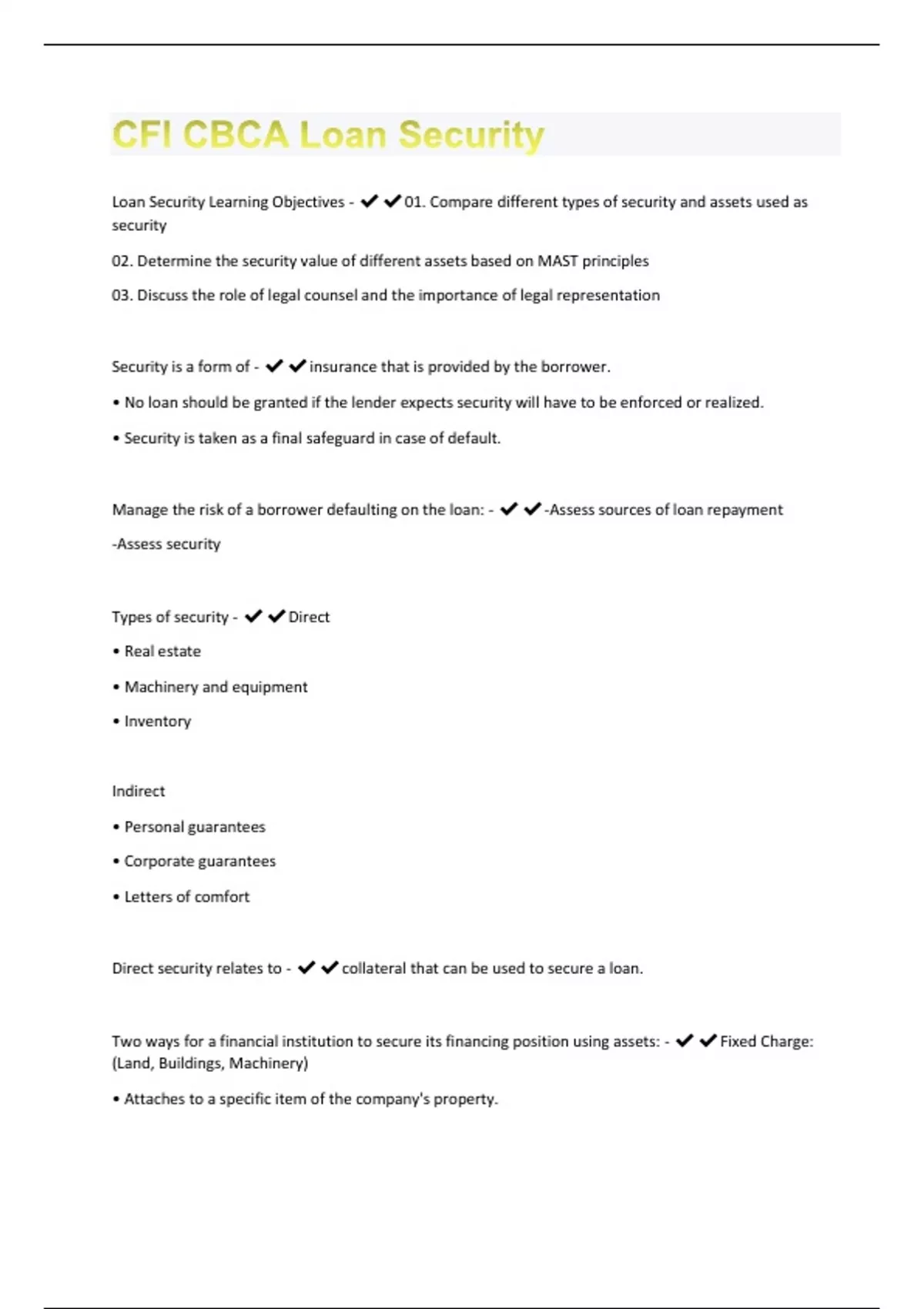 Loan Security Learning Objectives - 01. Compare different types of security and assets used as security 02. Determine the security value of different assets based on MAST principles 03. Discuss the role of legal counsel and the importance of legal representation Security is a form of - insurance that is provided by the borrower. • No loan should be granted if the lender expects security will have to be enforced or realized. • Security is taken as a final safeguard in case of default. Manage the risk of a borrower defaulting on the loan: - -Assess sources of loan repayment -Assess security Types of security - Direct • Real estate • Machinery and equipment • Inventory Indirect • Personal guarantees • Corporate guarantees • Letters of comfort Direct security relates to - collateral that can be used to secure a loan. Two ways for a financial institution to secure its financing position using assets: -Fixed Charge: (Land, Buildings, Machinery) • Attaches to a specific item of the company's property.• The lender has legal right to the asset. • The charge fixes to the asset. Floating Charge: (Inventory, A/R, Marketable securities) • Attaches to a general class of assets. • Borrower can trade its assets during the ordinary course of business. • The charge would fix if there's an insolvency or a loan default. Two common ways to protect the lender with direct security: - Specific Collateral • Specific asset(s) • In the case of default, the lender takes ownership of the asset(s) General Security Agreement • All assets as a whole • In the case of default, the lender seizes the borrower's assets the most common form of indirect security. - A guarantee Here is a brief overview of three types of guarantees. - Limited guarantees Unlimited guarantees Personal • The guarantor is an individual. • The individual is personally responsible if the borrower is unable to repay the debt. • The lender has the right to pursue the guarantor's personal assets. Corporate • The guarantor is a company. • The company is responsible if the borrower is unable to repay the debt. • The companies are related through ownership.Joint & Several • There are multiple guarantors. • Any and all guarantors may be required to fulfill a borrower's debt obligation. • The lender may pursue any one of the guarantors for the full amount of the guarantee. Letter of Comfort: - It is a letter given by a third party (often the parent company) to help secure lending facilities for the borrower. It is a weaker form of reassurance because it is nonbinding and there is typically no recourse against the letter of comfort provider. Example wording: "The parent company will manage the business of the subsidiary (the borrower) in such a way as to meet its liabilities under the loan agreement." Assets Used as Security - Real Property Land • Immovable • Simple to establish and transfer legal title • Generally retains its value Buildings • Office buildings • Shopping centers • Hotels • Warehouses and factories Personal Property Personal property is any property other than real property. -Goods - -Inventory and equipment -Cash Instruments --Cash and money market securities -Chattel Paper - -Conditional sales contracts -Securities - -Bonds and equities -Intangibles - -Licenses and patents Evaluating Security It is important to evaluate the quality of assets to be used as security. Consider the following 4-point checklist when assessing potential collateral: - Marketable Ascertainable Stable Transferable Marketable Is there an active secondary market to sell the asset if needed? Ascertainable Is it easy to value the asset? Does the asset have a readily ascertainable price? Stable Does the asset's value change frequently or is it relatively stable? Transferrable Can the asset be easily transferred to a new owner? Evaluating the Quality of Accounts Receivable - -Customer base -Bad debt experience -Aging -Credit policies• Aged receivable list