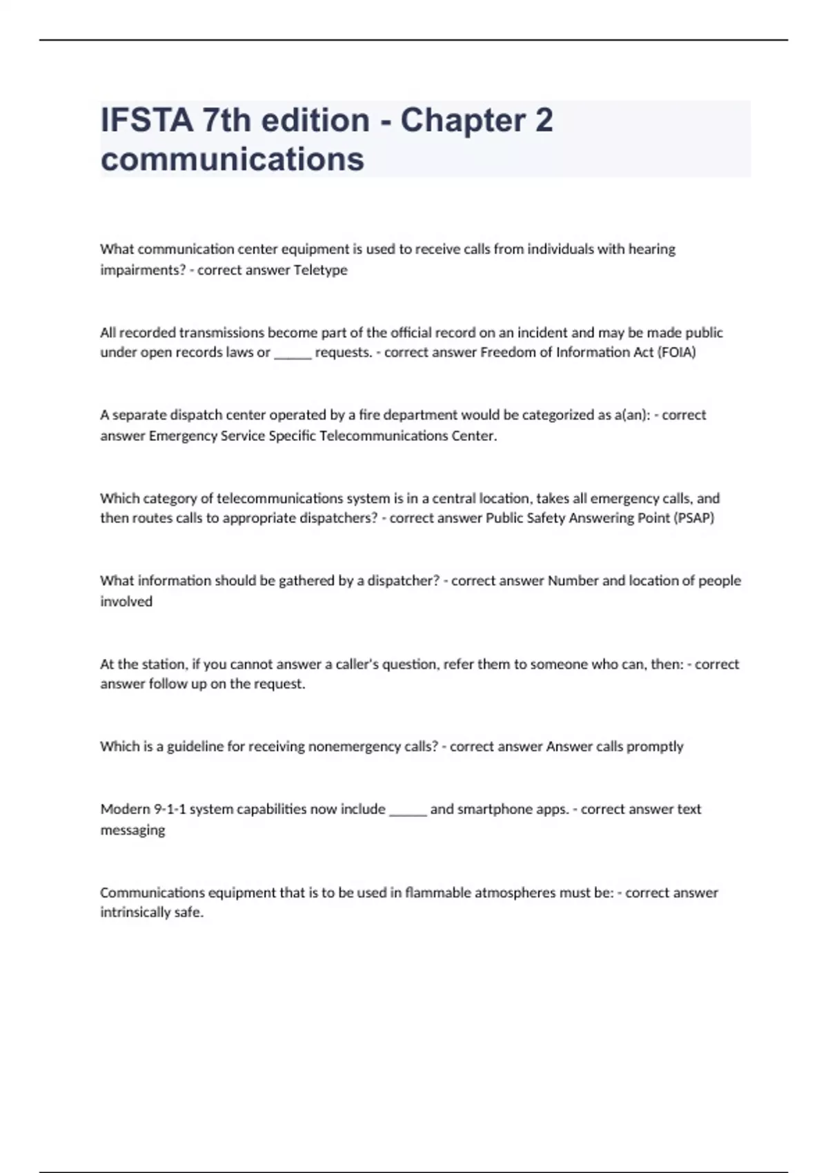 IFSTA 7th edition - Chapter 2 communicationsWhat communication center equipment is used to receive calls from individuals with hearing impairments? - correct answer Teletype All recorded transmissions become part of the official record on an incident and may be made public under open records laws or _____ requests. - correct answer Freedom of Information Act (FOIA) A separate dispatch center operated by a fire department would be categorized as a(an): - correct answer Emergency Service Specific Telecommunications Center. Which category of telecommunications system is in a central location, takes all emergency calls, and then routes calls to appropriate dispatchers? - correct answer Public Safety Answering Point (PSAP) What information should be gathered by a dispatcher? - correct answer Number and location of people involved At the station, if you cannot answer a caller's question, refer them to someone who can, then: - correct answer follow up on the request. Which is a guideline for receiving nonemergency calls? - correct answer Answer calls promptly Modern 9-1-1 system capabilities now include _____ and smartphone apps. - correct answer text messaging Communications equipment that is to be used in flammable atmospheres must be: - correct answer intrinsically safe.