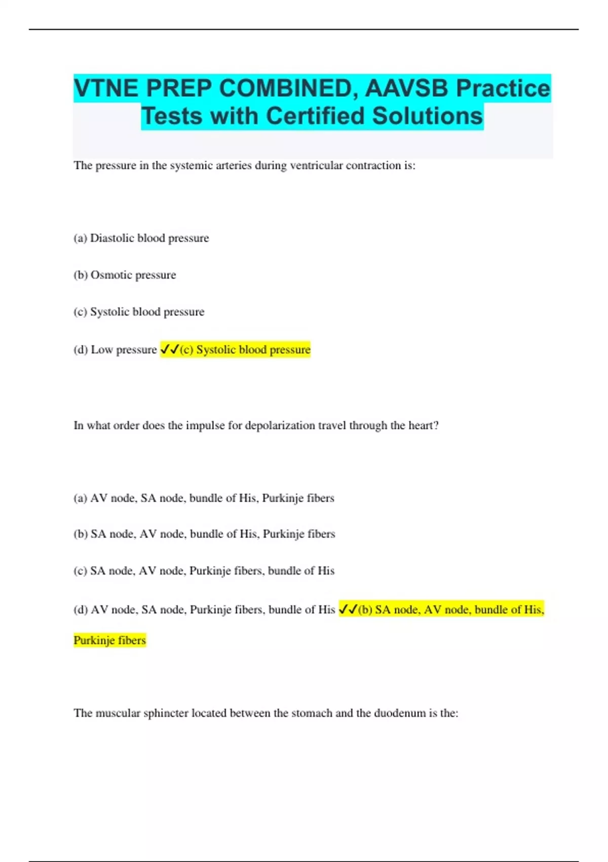 The pressure in the systemic arteries during ventricular contraction is: (a) Diastolic blood pressure (b) Osmotic pressure (c) Systolic blood pressure (d) Low pressure (c) Systolic blood pressure In what order does the impulse for depolarization travel through the heart? (a) AV node, SA node, bundle of His, Purkinje fibers (b) SA node, AV node, bundle of His, Purkinje fibers (c) SA node, AV node, Purkinje fibers, bundle of His (d) AV node, SA node, Purkinje fibers, bundle of His (b) SA node, AV node, bundle of His, Purkinje fibers