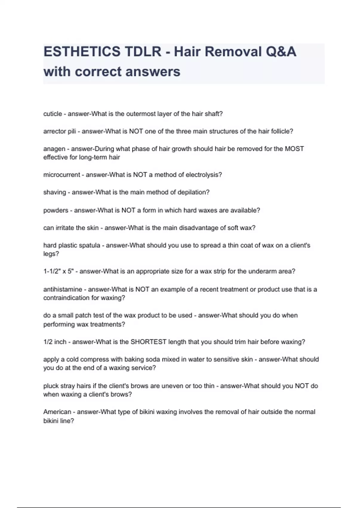 - ESTHETICS TDLR - Hair Removal Q&A with corrct ans