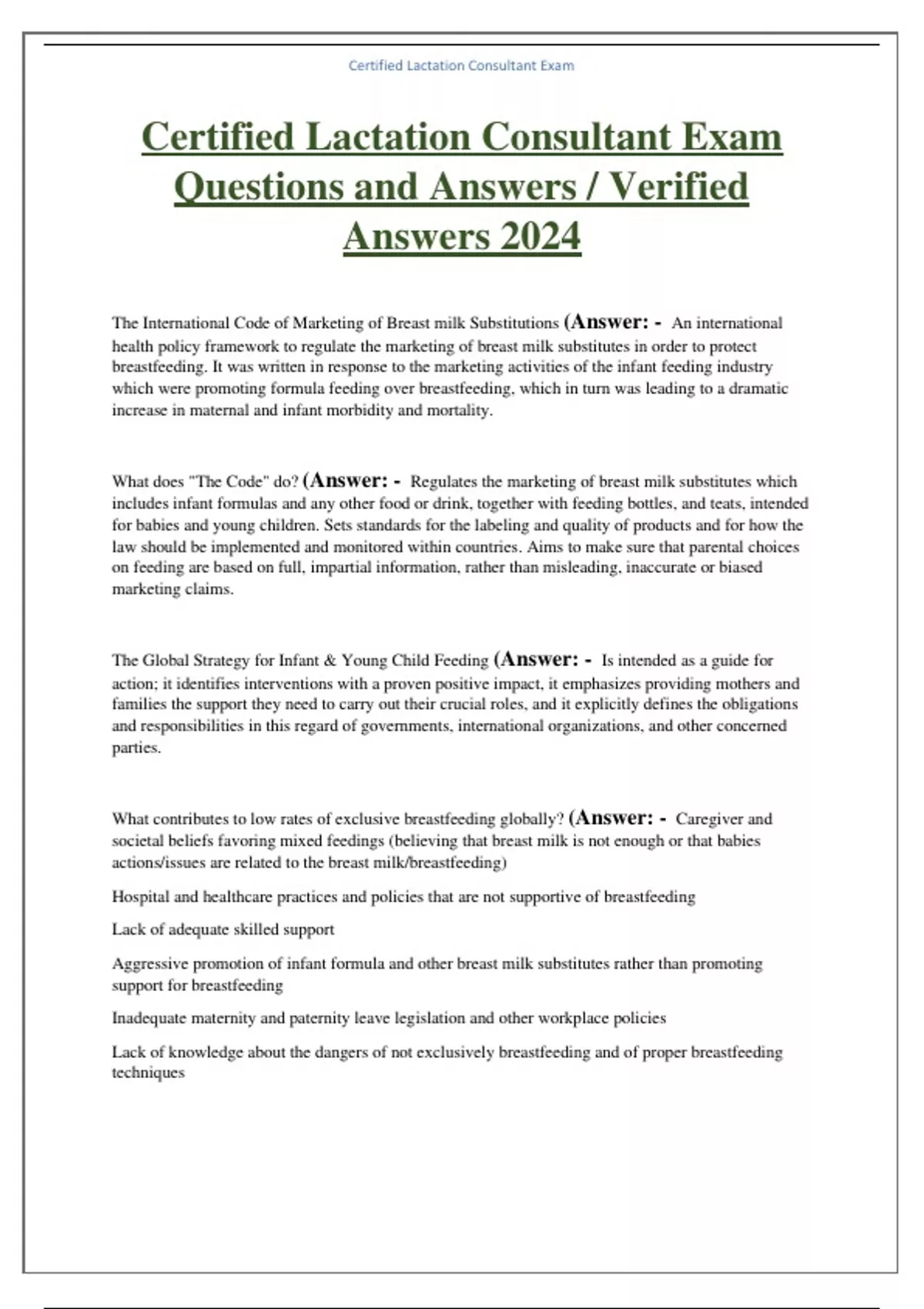 Certified Lactation Consultant Exam Questions and Answers / Verified Answers 2024 The International Code of Marketing of Breast milk Substitutions (Answer: - An international health policy framework to regulate the marketing of breast milk substitutes in order to protect breastfeeding. It was written in response to the marketing activities of the infant feeding industry which were promoting formula feeding over breastfeeding, which in turn was leading to a dramatic increase in maternal and infant morbidity and mortality. What does "The Code" do? (Answer: - Regulates the marketing of breast milk substitutes which includes infant formulas and any other food or drink, together with feeding bottles, and teats, intended for babies and young children. Sets standards for the labeling and quality of products and for how the law should be implemented and monitored within countries. Aims to make sure that parental choices on feeding are based on full, impartial information, rather than misleading, inaccurate or biased marketing claims. The Global Strategy for Infant & Young Child Feeding (Answer: - Is intended as a guide for action; it identifies interventions with a proven positive impact, it emphasizes providing mothers and families the support they need to carry out their crucial roles, and it explicitly defines the obligations and responsibilities in this regard of governments, international organizations, and other concerned parties.