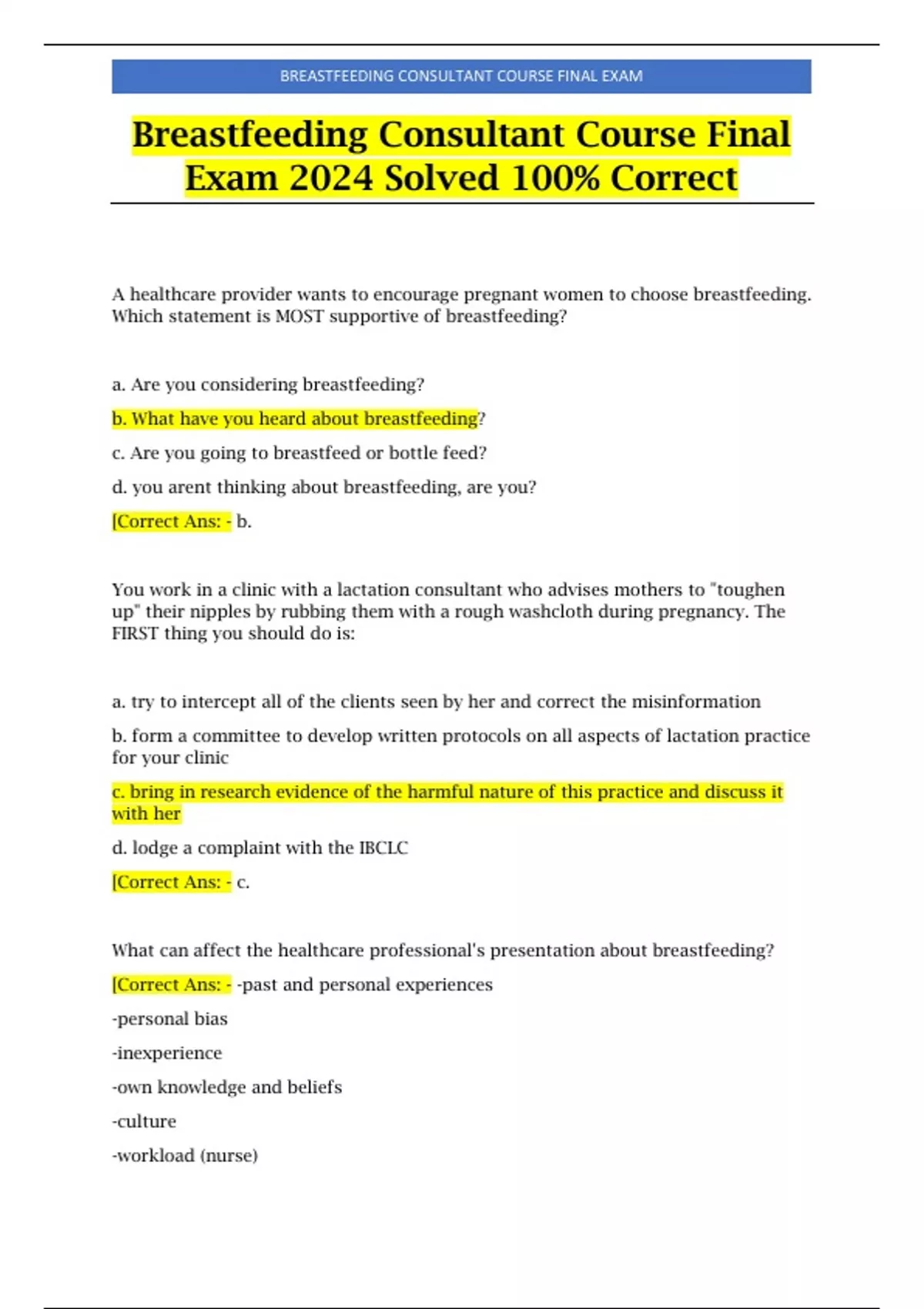 Breastfeeding Consultant Course Final Exam 2024 Solved 100% Correct