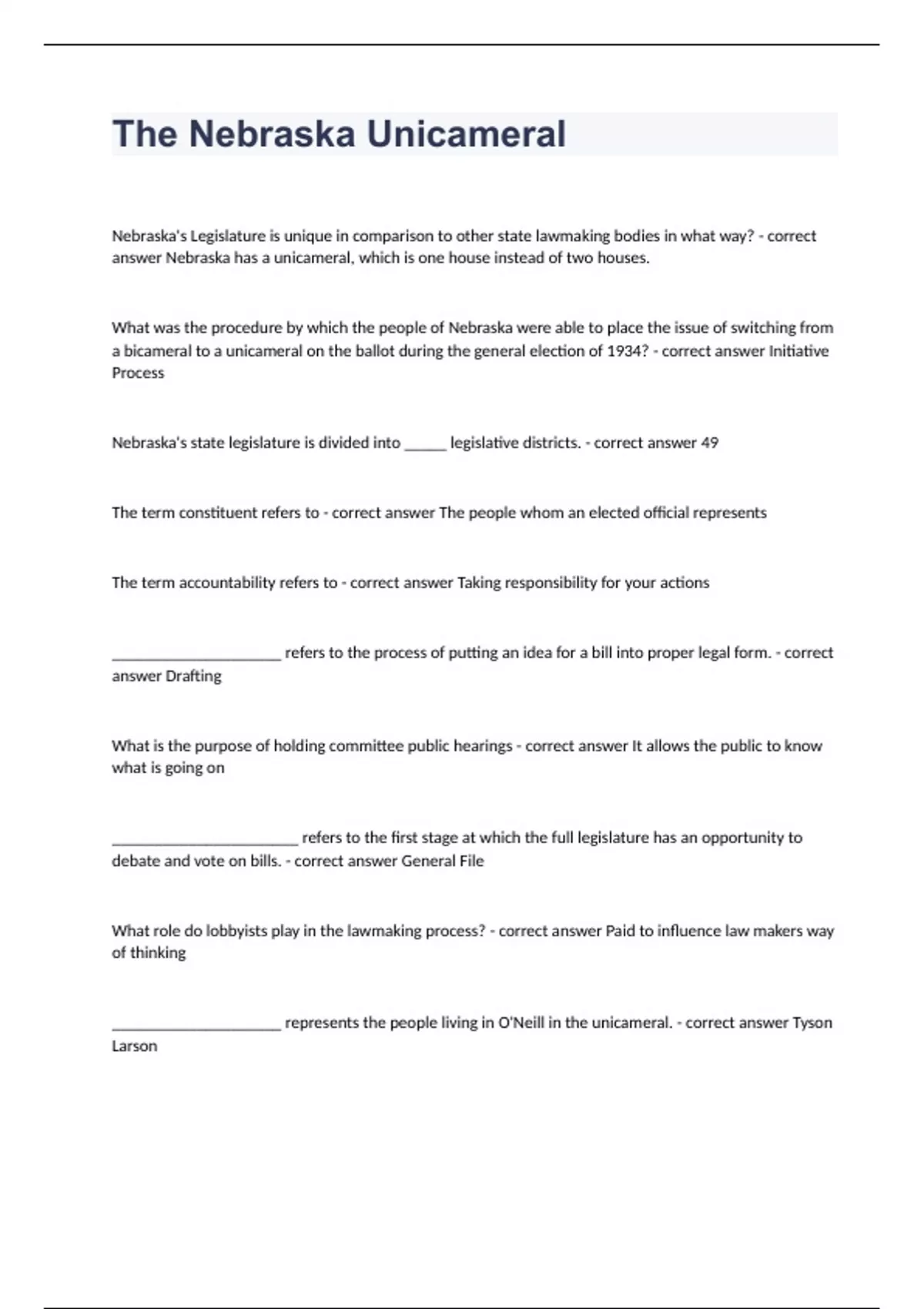 The Nebraska Unicameral Question and answers rated A+ 2023/2024Nebraska's Legislature is unique in comparison to other state lawmaking bodies in what way? - correct answer Nebraska has a unicameral, which is one house instead of two houses. What was the procedure by which the people of Nebraska were able to place the issue of switching from a bicameral to a unicameral on the ballot during the general election of 1934? - correct answer Initiative Process Nebraska's state legislature is divided into _____ legislative districts. - correct answer 49 The term constituent refe