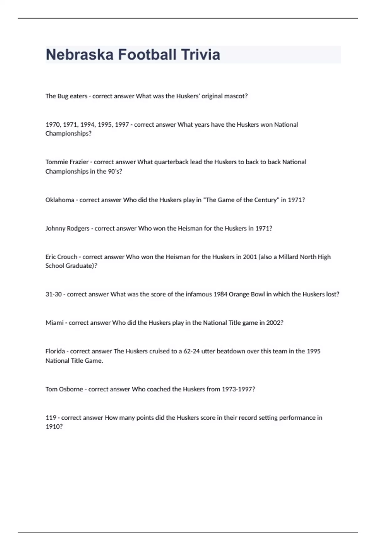 Nebraska Football Trivia Question and answers correctly solved 2023/2024 The Bug eaters - correct answer What was the Huskers' original mascot? 1970, 1971, 1994, 1995, 1997 - correct answer What years have the Huskers won National Championships? Tommie Frazier - correct answer What quarterback lead the Huskers to back to back National Championships in the 90's? Oklahoma - correct answer Who did the Huskers play in "The Game of the Century" in 1971? Johnny Rodgers - correct answer Who won the Heisman for the Huskers in 1971? Eric Crouch - correct answer Who won the Heisman for the Huskers in 2001 (also a Millard North High School Graduate)?
