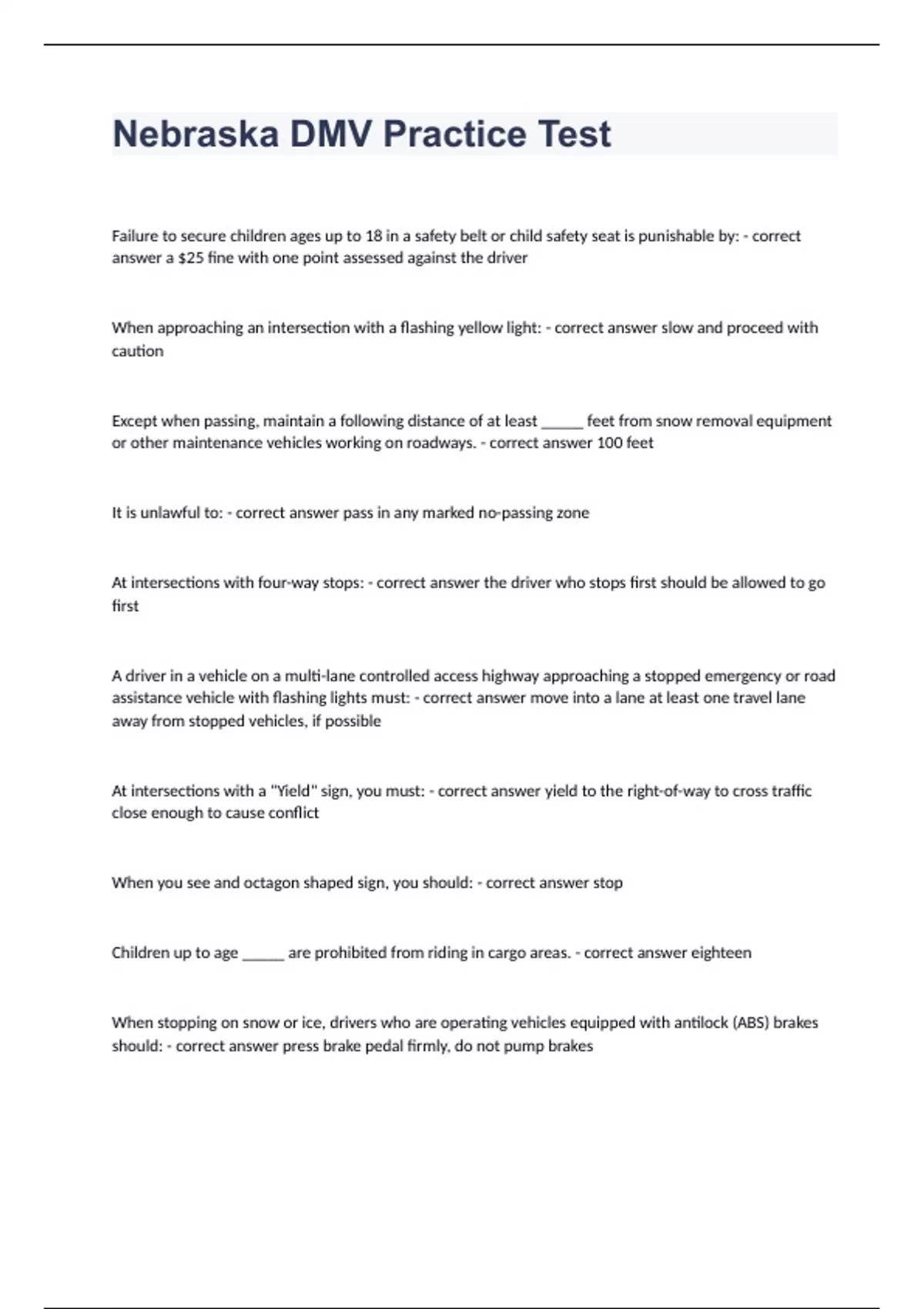 Nebraska DMV Practice Test Question and answers rated 2023/2024 Failure to secure children ages up to 18 in a safety belt or child safety seat is punishable by: - correct answer a $25 fine with one point assessed against the driver When approaching an intersection with a flashing yellow light: - correct answer slow and proceed with caution Except when passing, maintain a following distance of at least _____ feet from snow removal equipment or other maintenance vehicles working on roadways. - correct answer 100 feet It is unlawful to: - correct answer pass in any marked no-passing zone