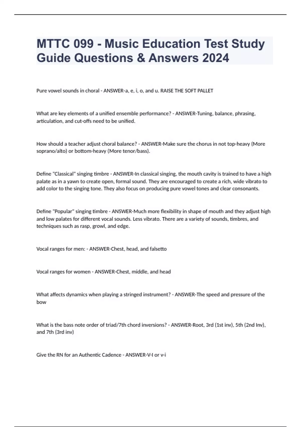 MTTC 099 - Music Education Test Study Guide Questions & Answers 2024 Pure vowel sounds in choral - ANSWER-a, e, i, o, and u. RAISE THE SOFT PALLET What are key elements of a unified ensemble performance? - ANSWER-Tuning, balance, phrasing, articulation, and cut-offs need to be unified. How should a teacher adjust choral balance? - ANSWER-Make sure the chorus in not top-heavy (More soprano/alto) or bottom-heavy (More tenor/bass). Define "Classical" singing timbre - ANSWER-In classical singing, the mouth cavity is trained to have a high palate as in a yawn to create open, formal sound. They are encouraged to create a rich, wide vibrato to add color to the singing tone. They also focus on producing pure vowel tones and clear consonants. Define "Popular" singing timbre - ANSWER-Much more flexibility in shape of mouth and they adjust high and low palates for different vocal sounds. Less vibrato. There are a variety of sounds, timbres, and techniques such as rasp, growl, and edge. Vocal ranges for men: - ANSWER-Chest, head, and falsetto Vocal ranges for women - ANSWER-Chest, middle, and head What affects dynamics when playing a stringed instrument? - ANSWER-The speed and pressure of the bow What is the bass note order of triad/7th chord inversions? - ANSWER-Root, 3rd (1st inv), 5th (2nd Inv), and 7th (3rd inv) Give the RN for an Authentic Cadence - ANSWER-V-I or v-i