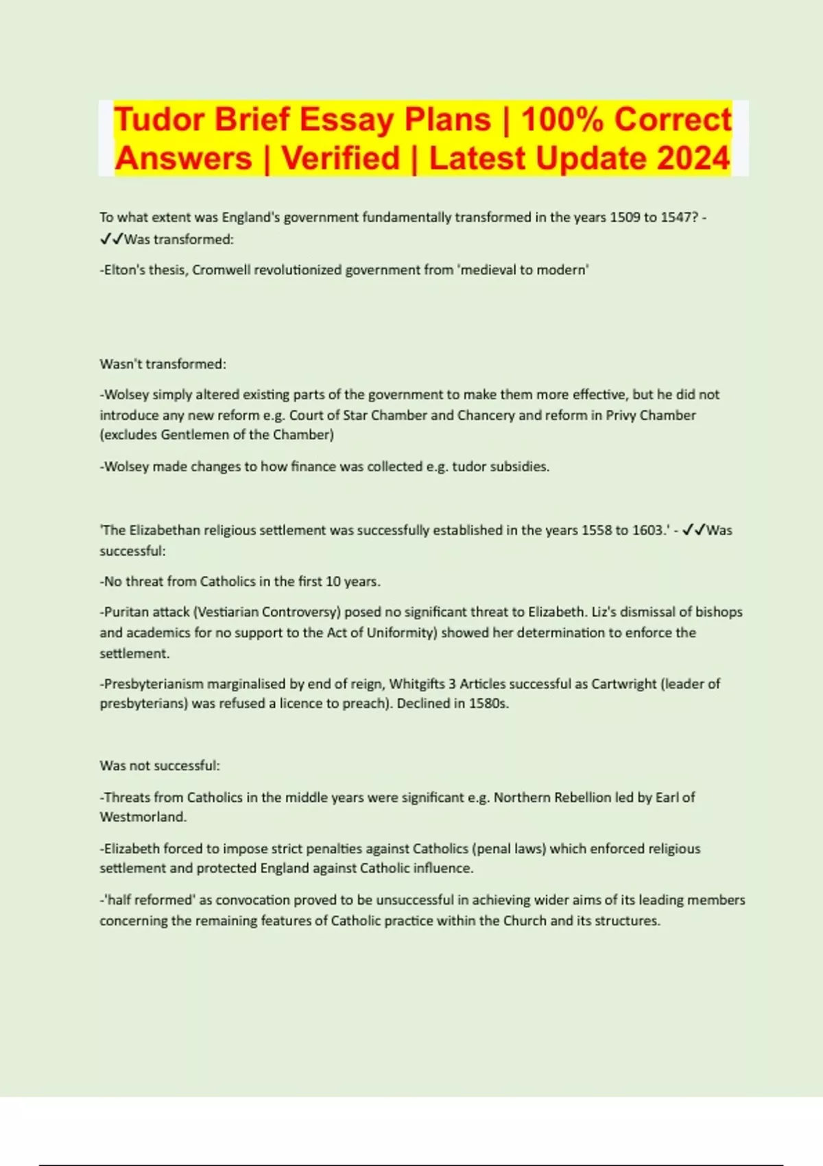 Tudor Brief Essay Plans | 100% Correct Answers | Verified | Latest Update 2024