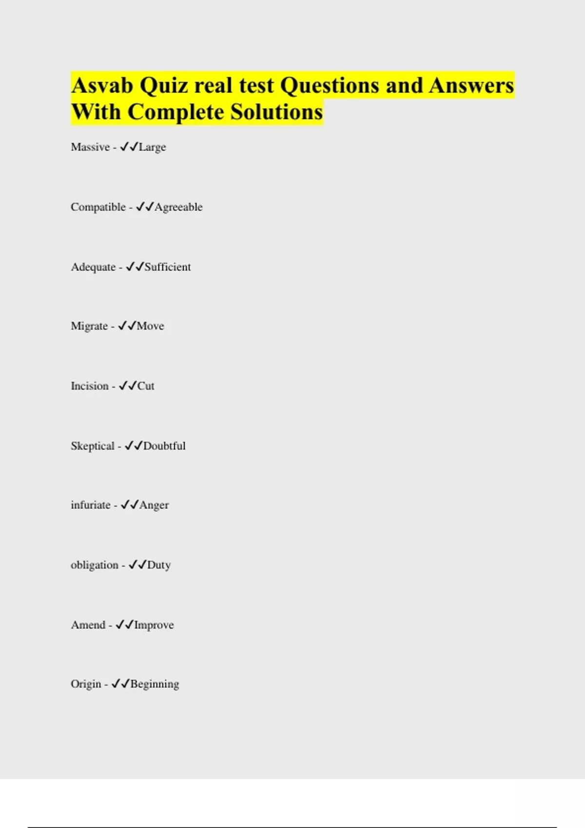 Massive - Large Compatible - Agreeable Adequate - Sufficient Migrate - Move Incision - Cut Skeptical - Doubtful infuriate - Anger obligation - Duty Amend - Improve